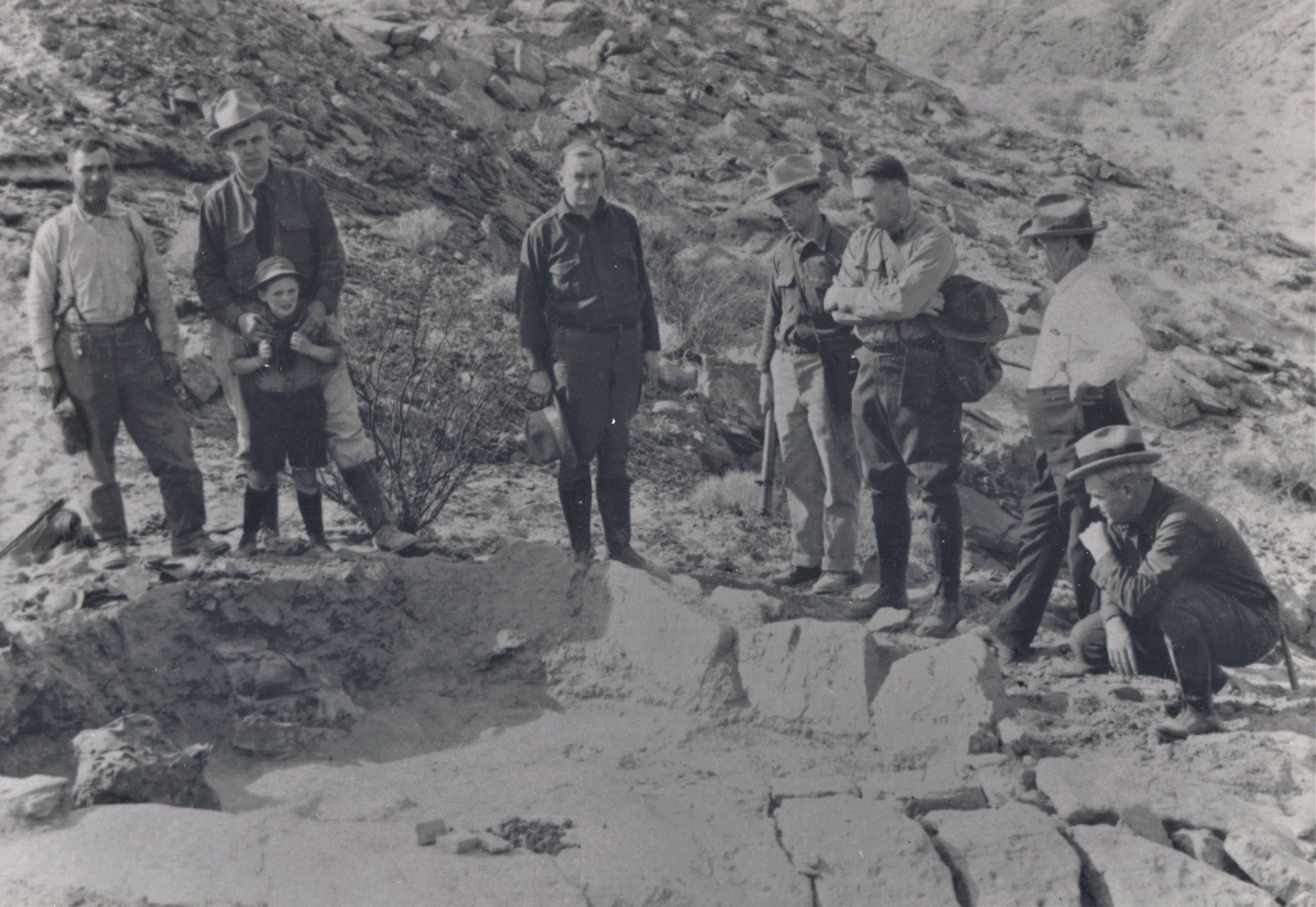 Notes: L-R: George Evans, excavator; M.R. Harrington & Son Bonny; NV. Gov. James Scrugham; Mr. Wright, journalist; Dr. C.W. West; NV. State Senator Levi Syphus; Mr. MacSheny, sergeant of NV. State Police