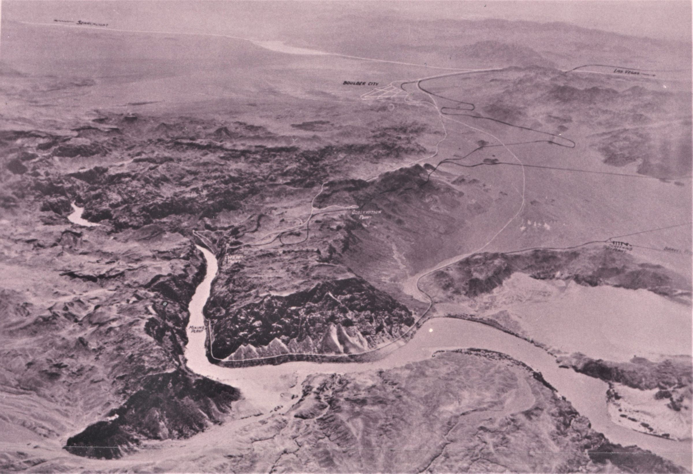 Black Canyon; 1920s-30s; aerial view of the Colorado River; and Black Canyon; with proposed dam site; Boulder City townsite; and roads; and railroads; worked, ca. 1920s-30; National Park Service photoCollection