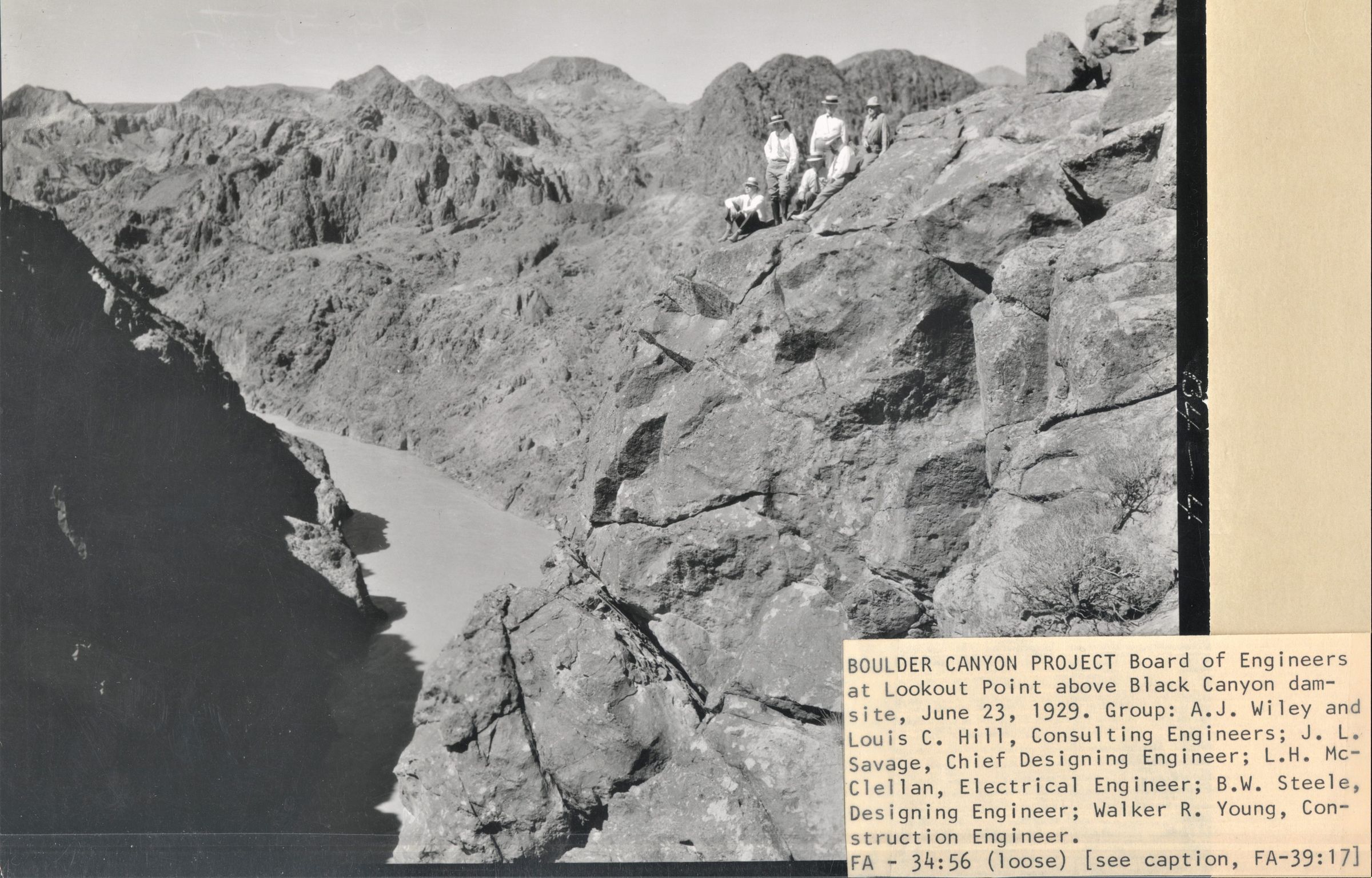 Black Canyon; 1929-31; Boulder Canyon Project; Board of Engineers; at Lookout Point; above the dam site; June 23, 1929; A.J. Wiley; and Louis C. Hill; consulting engineers; John Lucien Savage chief designing engineer; L.H. mcClellan, electrical engineer; B.W. Steele, designing engineer; Walker R. Young, construction engineerCollection