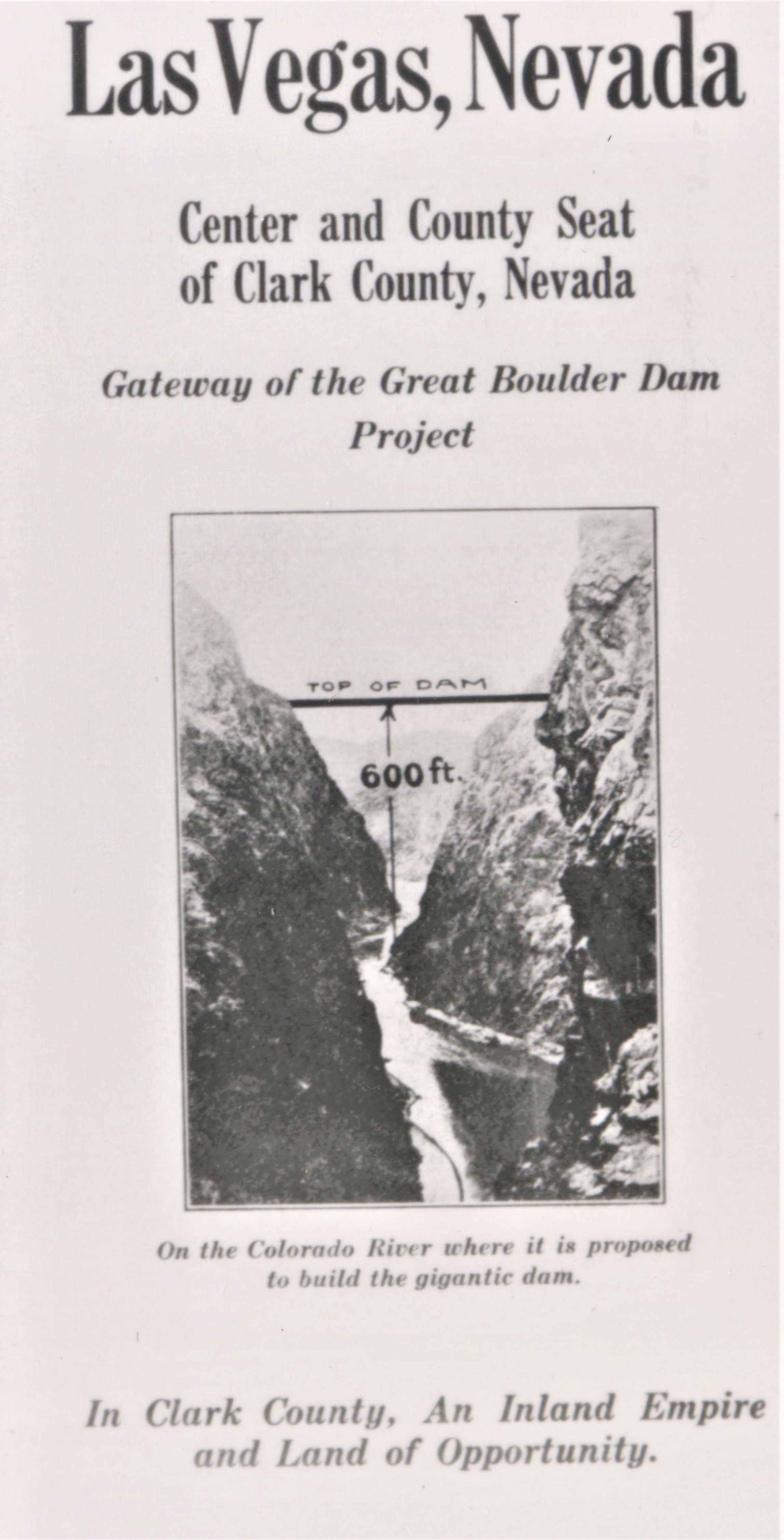 Las Vegas; association with Hoover Dam; promotional brochure with schematic of Hoover Dam; 1920s; UNLSCollection