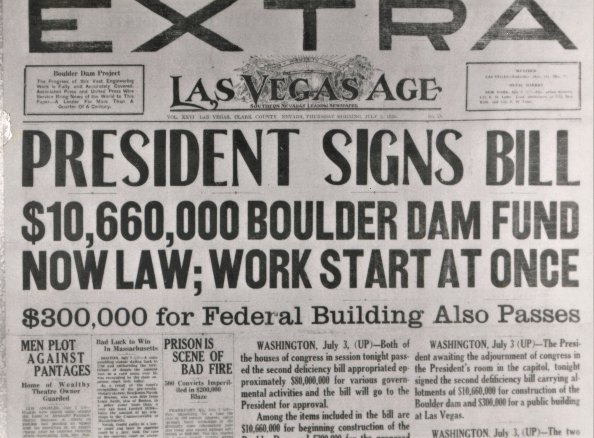 Hoover Dam; headline; "President Signs Bill "; appropriations; Las Vegas Age extra; July 3, 1930; p.1Collection