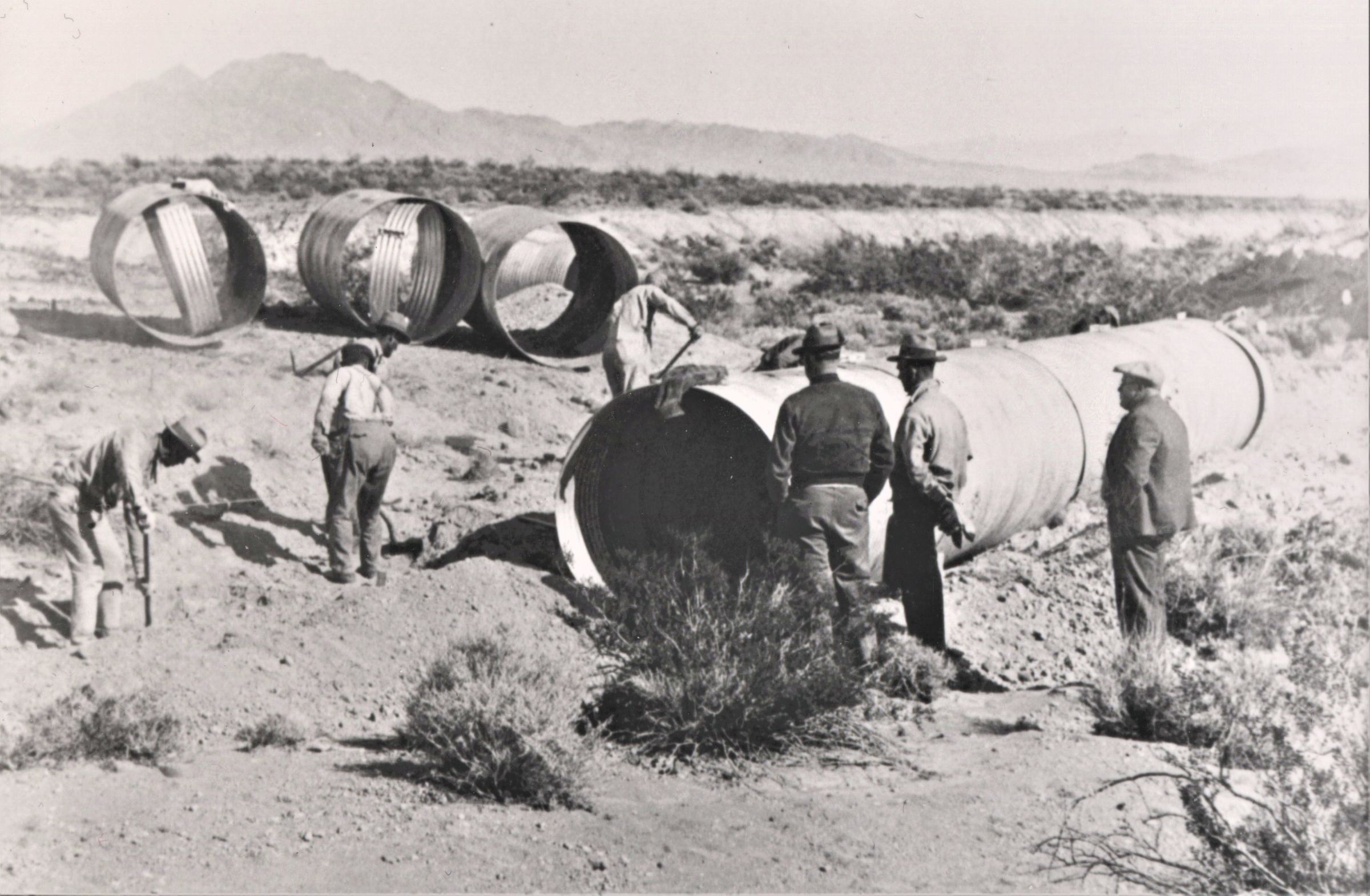 Union Pacific Railroad; Boulder City branch-line; under construction; c. October 1930; track workers laying steel culvert pipe; NSMHS photo no.1043Collection