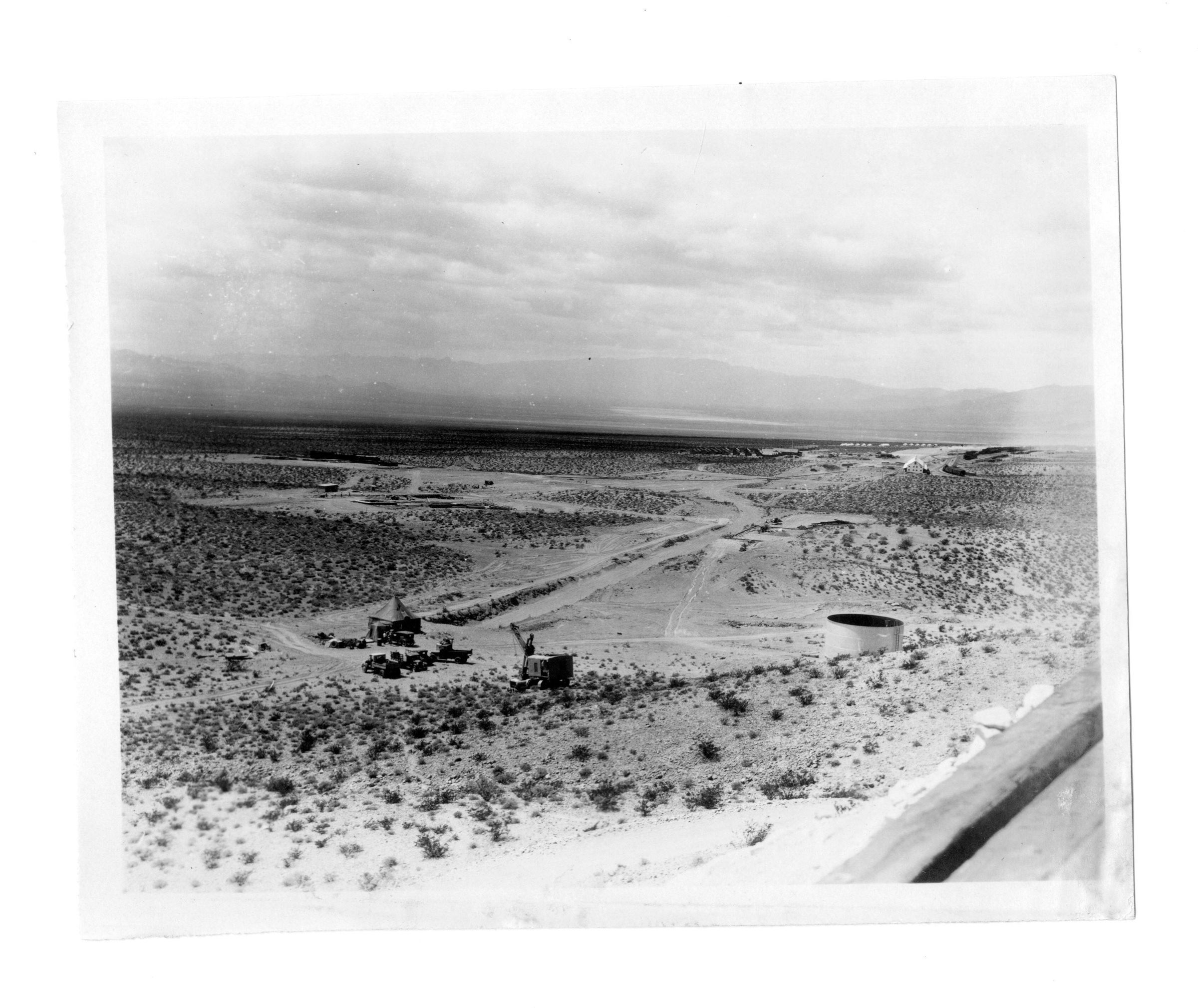 Notes: Description continued: Colorado St.; the white building in the right distance is the Six Companies warehouse; to the upper left of the regulating tank is foundation for the U.S. Bureau of Reclamation warehouse)