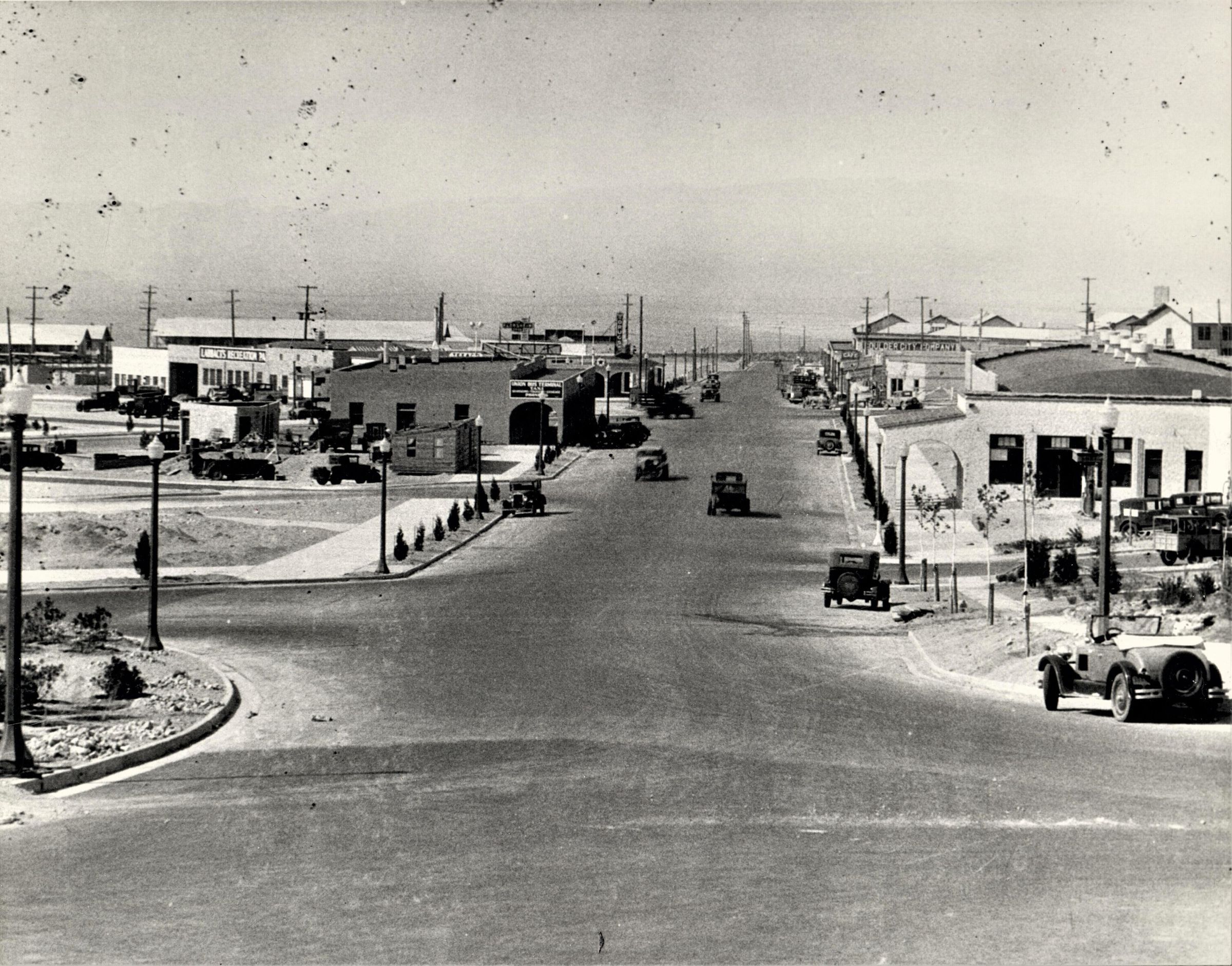 Boulder City business district; view south down Nevada Hwy; intersection with Colorado St.; same view as 0437, only later; note newly planted landscaping; May 6, 1932; USBR: BCP 1247A; A.G. Beyer, photographerMade/Created
