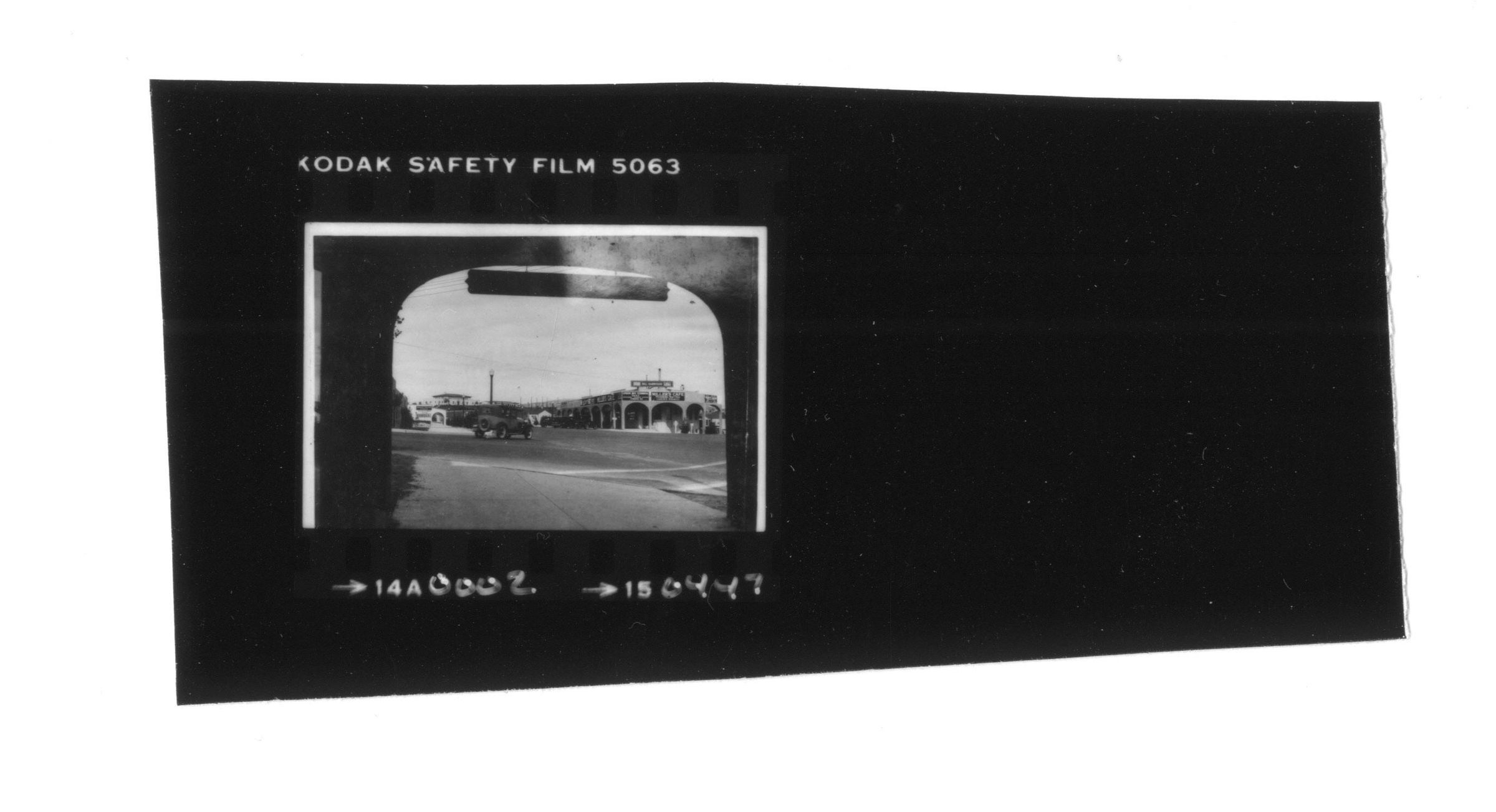 Boulder City business district; view northeast; across the intersection of Nevada Hwy; & Arizona St.; from the arches of the Nevada Drug Store; Terminal Building on the corner; Oct. 21, 1933; USBR; Wash. no. 2112/ temp no. 1628; Ben Glaha, photographerMade/Created