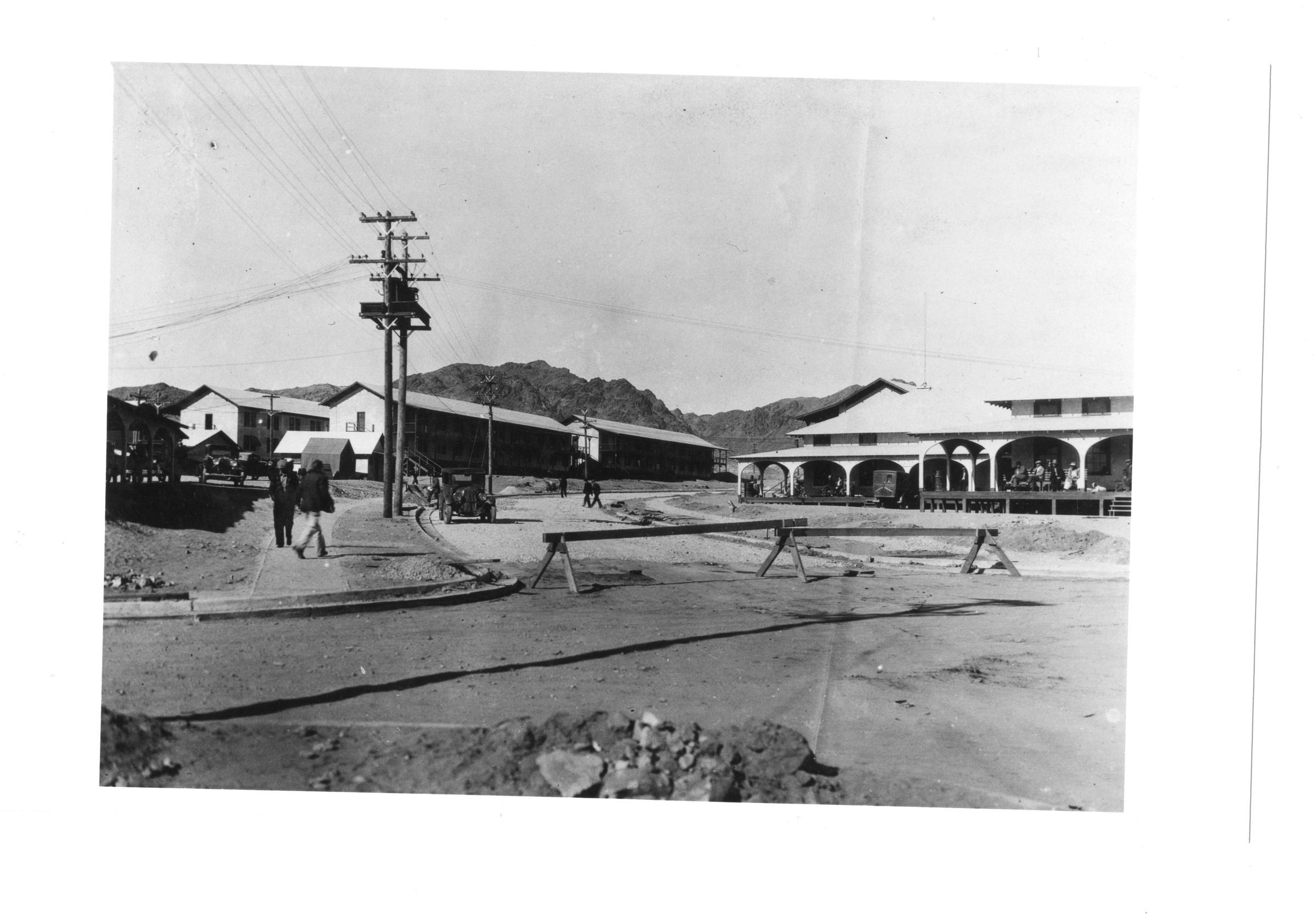 Boulder City; Six Companies; view from intersection of Cherry St.; with NV. Hwy; l-r: Boulder City Company office (arches); dormitories; recreation hall; USBR; Ben Glaha, photographerMade/Created