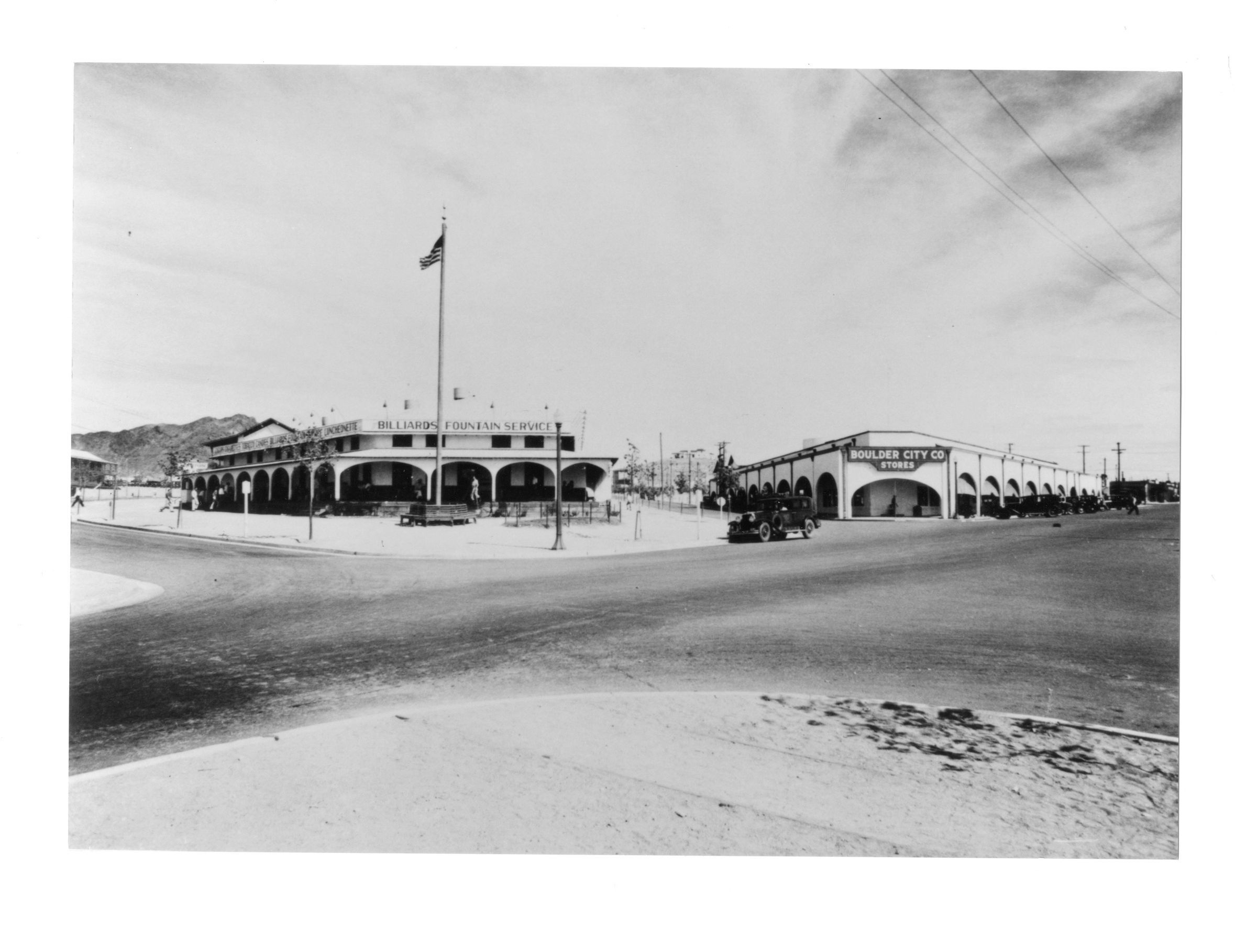 Boulder City; Six Co.'s.recreation hall; Foreground: Intersection of Nevada Way; Birch Street; Cherry Street; and New Mexico; USBR; Wash. no. 2093/ temp no. 1609; Ben Glaha, photographerMade/Created