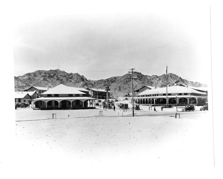 Boulder City; Six Co.'s; intersection of Cherry St. & Nevada Hwy; Boulder City Company office, left; recreation hall, right, with signs under constructionMade/Created