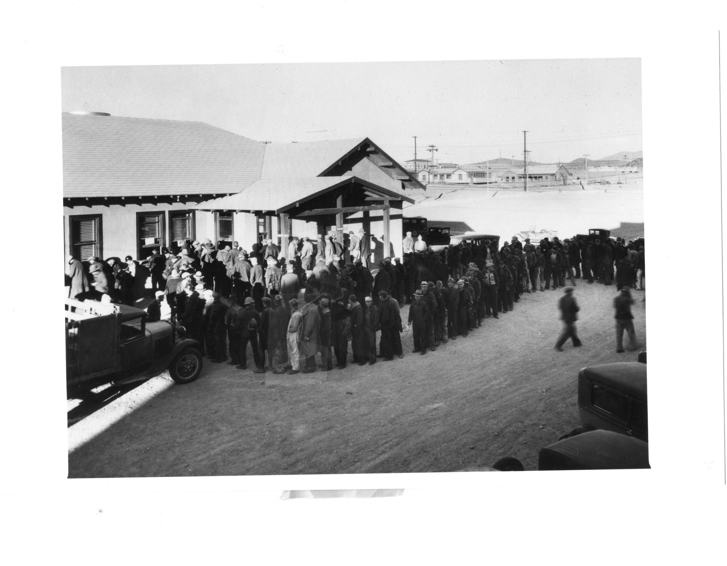 Boulder City Six Co.'s: payday; collected at the paymaster's window behind the Six Cos. office building; the men are paid on the 10th & 25th of each month; This view shows the swing shift lined up at the paymaster's window on Jan. 25, 1932; Boulder City Library; Bechtel album; photo no. 822Made/Created