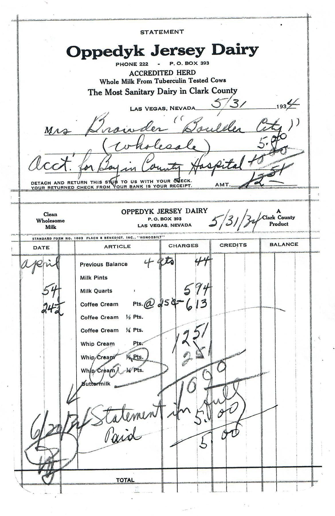Oppedyk Dairy statement 1934