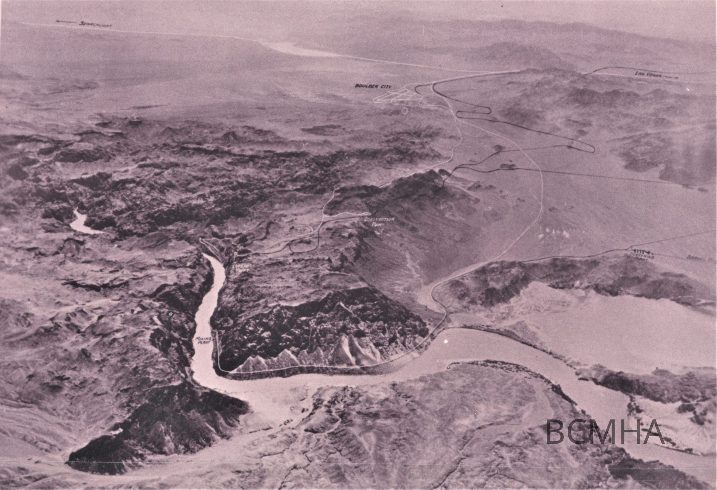 Black Canyon; 1920s-30s; aerial view of the Colorado River; and Black Canyon; with proposed dam site; Boulder City townsite; and roads; and railroads; worked, ca. 1920s-30; National Park Service photoCollection