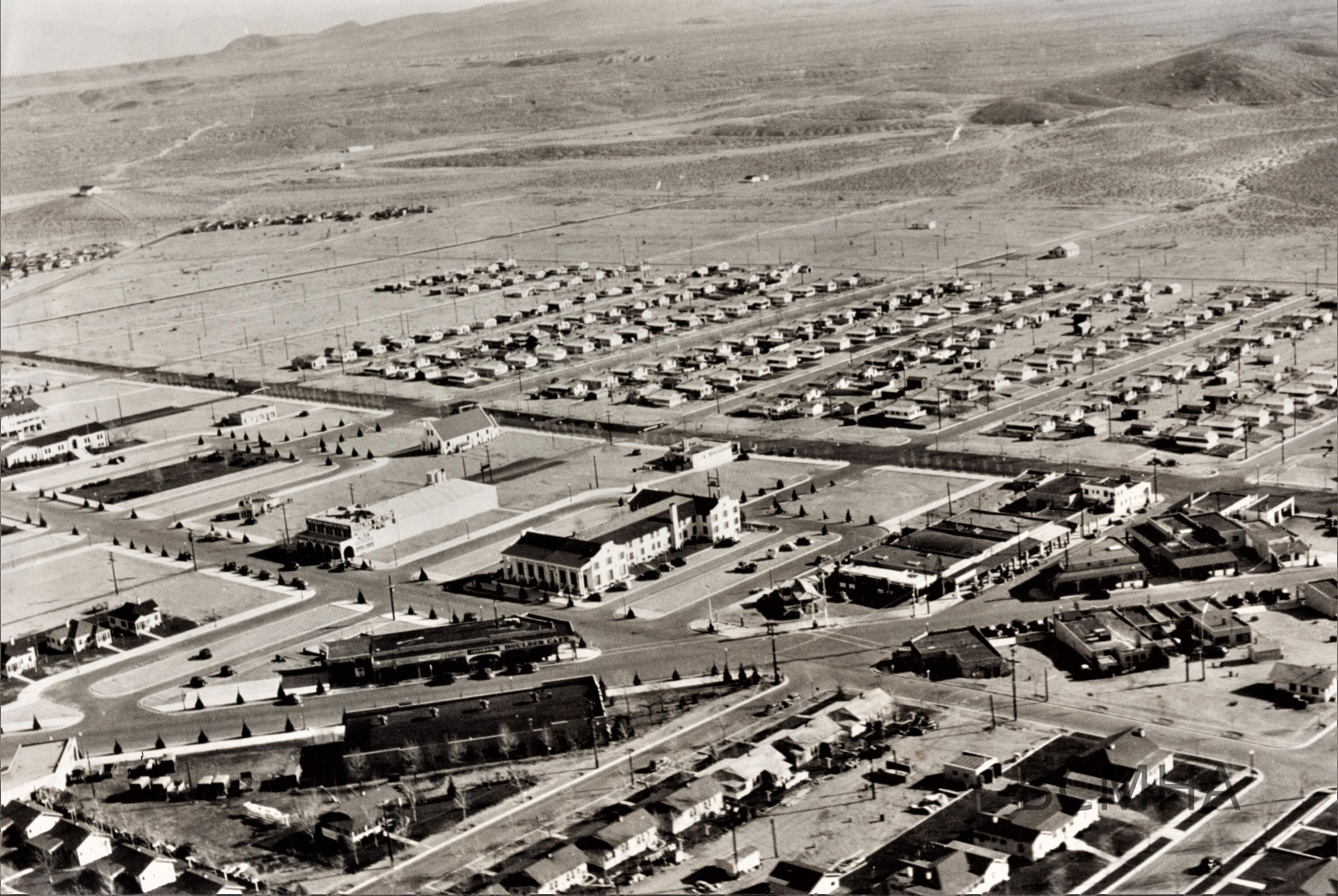 "Boulder City taken from an airplane. Camp (CCC) is just out of picture on the right. Arrow points the St. of its location. Hotel just right of the theatre- where many movie stars & celebrities stay. Prettiest residential section out of picture in lower left hand corner of picture. Homes shown are houses built during dam construction for workers. Workmen of dam still live in them. " (Major Merrick)Made/Created