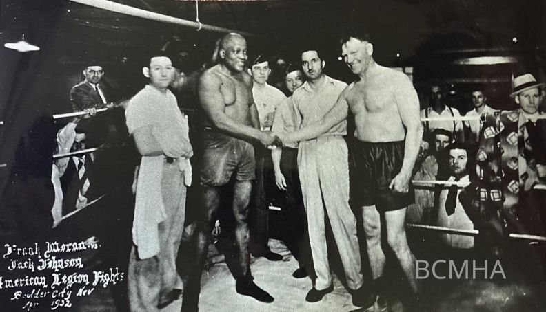 Boulder City: Anderson Brothers mess hall; boxing match between Frank Moran and Jack Johnson; sponsored by the American Legion Post 31 on April 15, 1932; right background: hat-less young man with the long nose is Thomas R. “Bob” ParkerLexicon