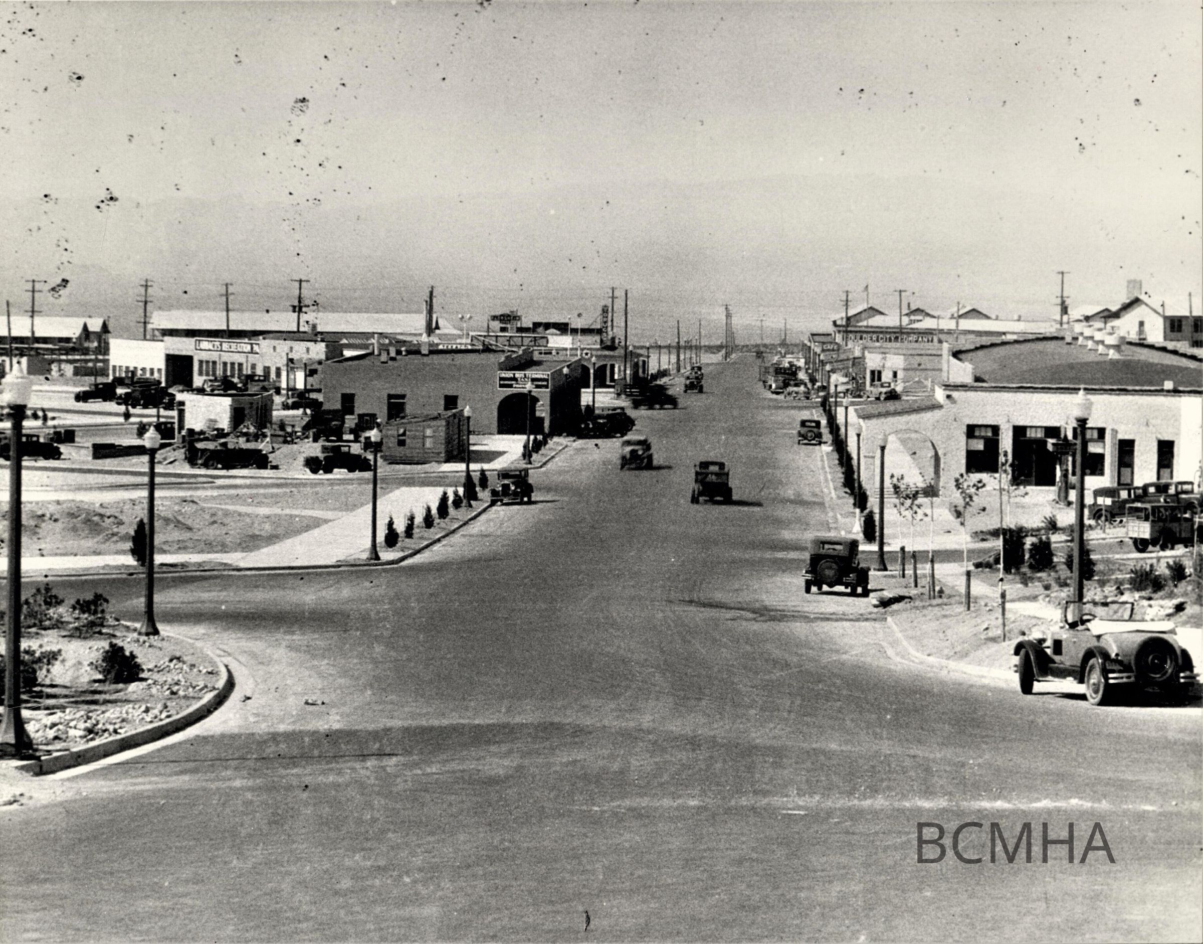 Boulder City business district; view south down Nevada Hwy; intersection with Colorado St.; same view as 0437, only later; note newly planted landscaping; May 6, 1932; USBR: BCP 1247A; A.G. Beyer, photographerMade/Created