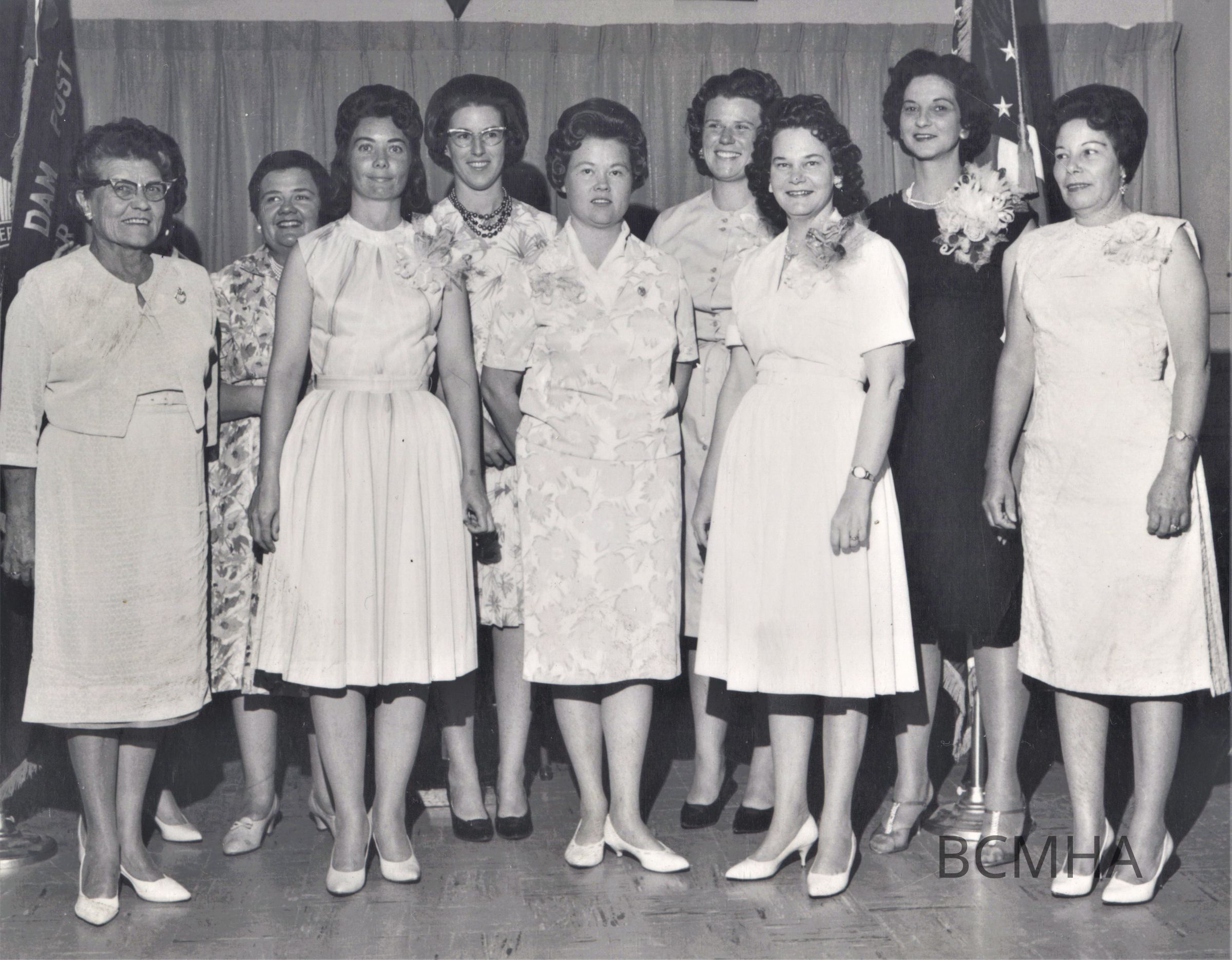 Boulder City clubs and organizations: VFW Auxiliary annual installation of officers, May 8, 1964 [l-r: Nan Estes, conductress; Phyllis Knox, second 1st year trustee (hidden behind Nan Estes); Lorie McDougal, patriotic instructor; Jean Ray, senior vice president; Barbara Polk, junior vice president; Mary Lee Daniel, outgoing president; Claudine Coker, 1st year trustee; Valda Slack, president; Rose Keele, treasurer.