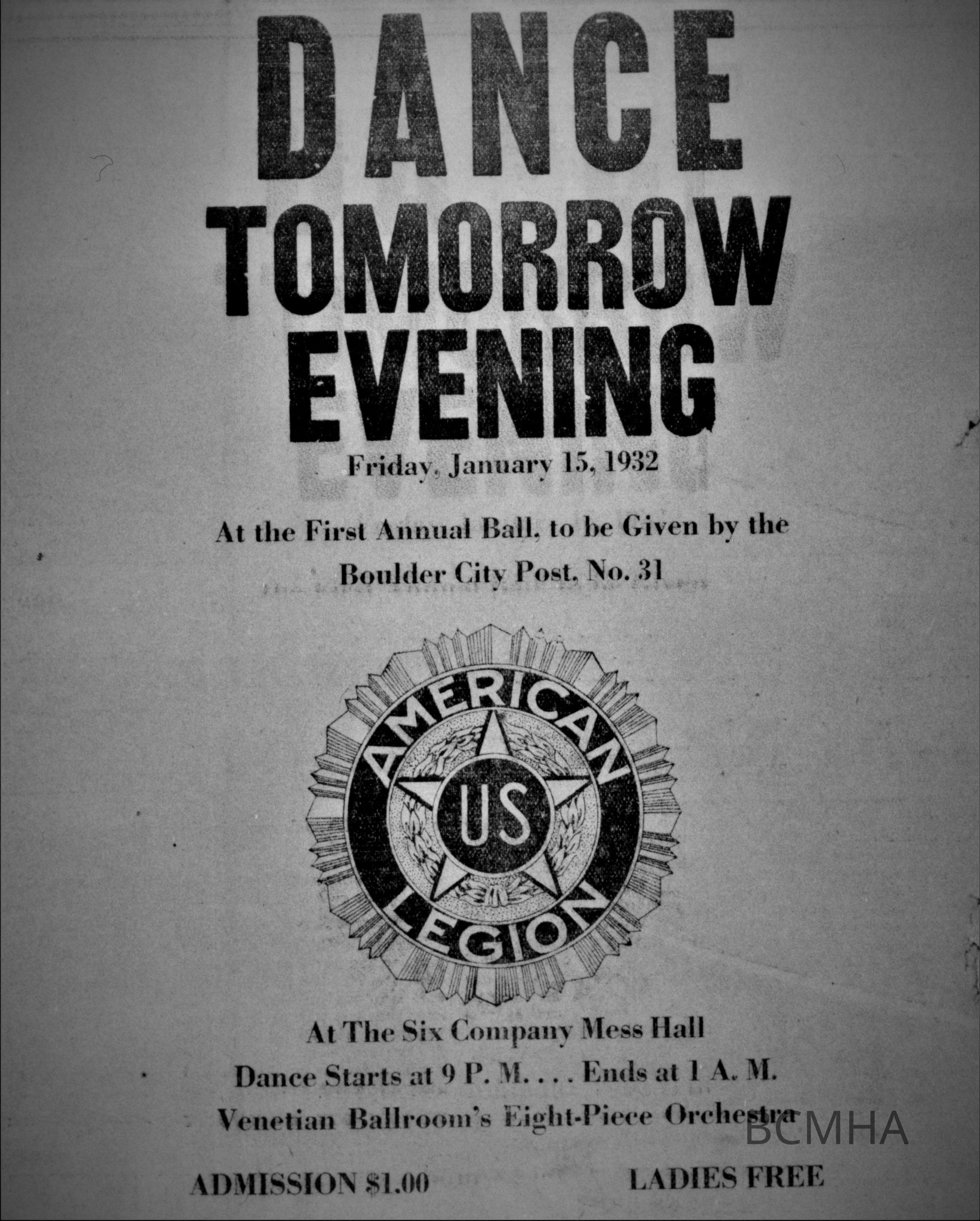 Boulder City clubs and organizations: American Legion Post 31: advertisements: 1st Annual Ball, January 15, 1932; Las Vegas Evening Review - Journal, Jan. 14, 1932, p. 4Collection