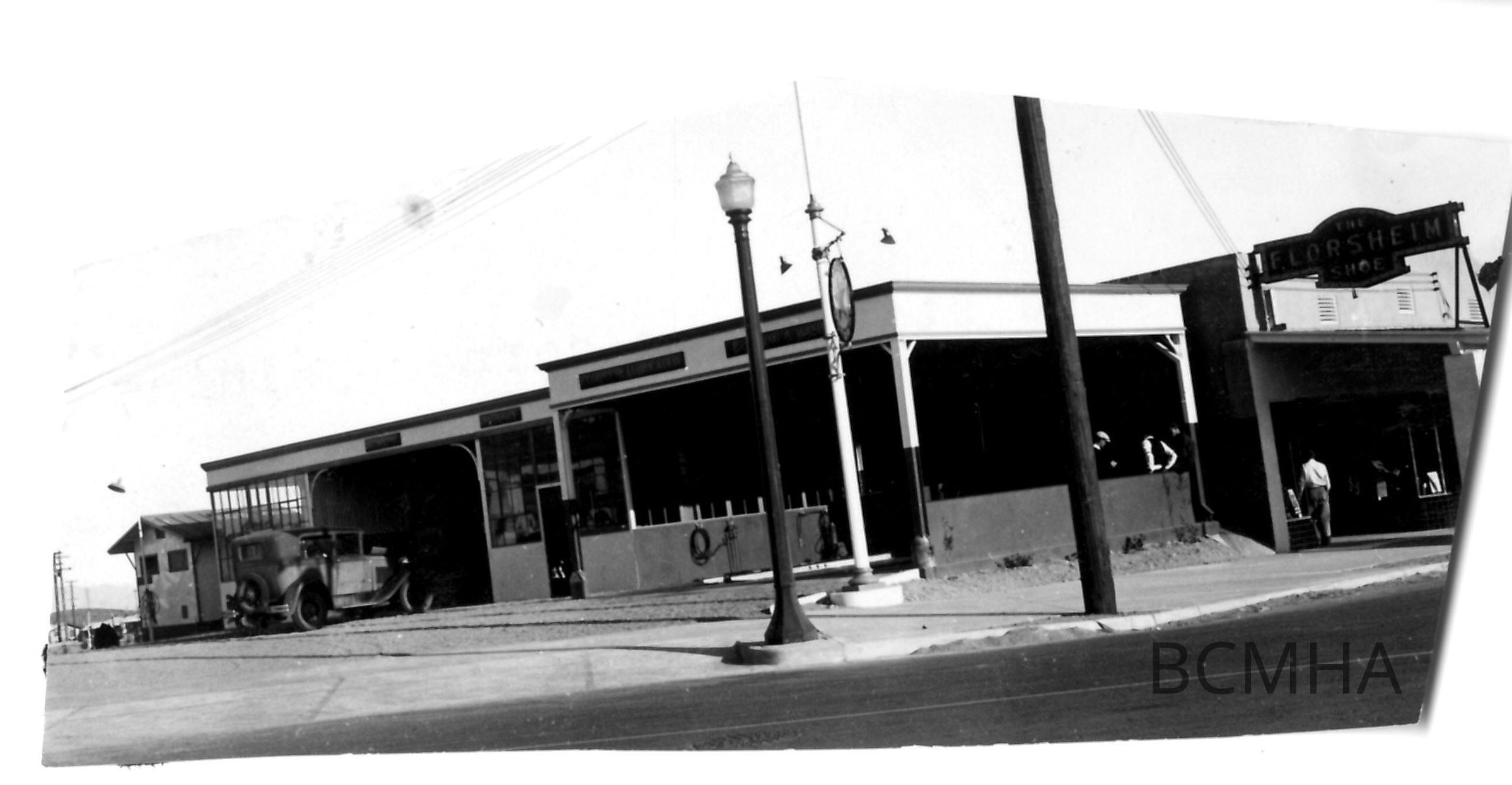 Texaco garage the gasoline station is to the left, out of the photo adjoining Fairbanks' Men's Store on the corner of Ave B & NV. Hwy, 1932; Joe Manix photoMade/Created