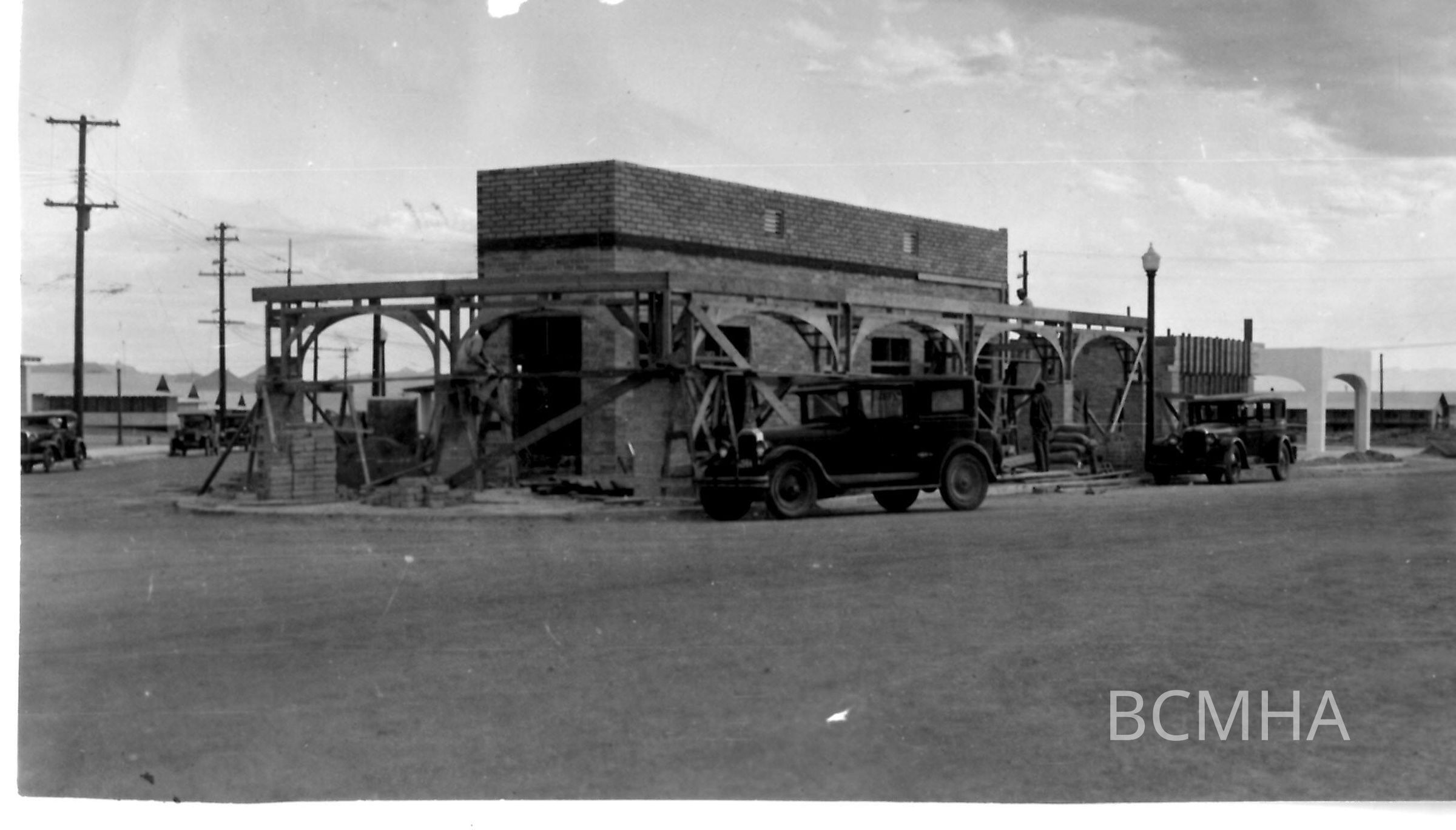 The Boulder (aka Barney Delmar's) Drugstore under construction on the corner of the NV. (Boulder) Hwy & Ave. B (left) 1932; Joe Manix photoMade/Created