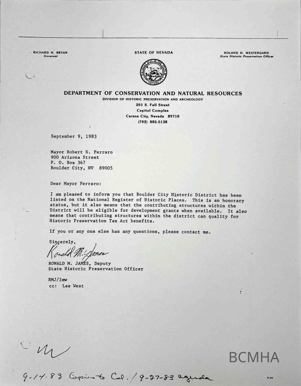 On August 19, 1983, Boulder City’s original town site was named to the National Register of Historic Places after a series of studies conducted by Janus Associates in conjunction with the newly formed Boulder City Museum and Historical Association.