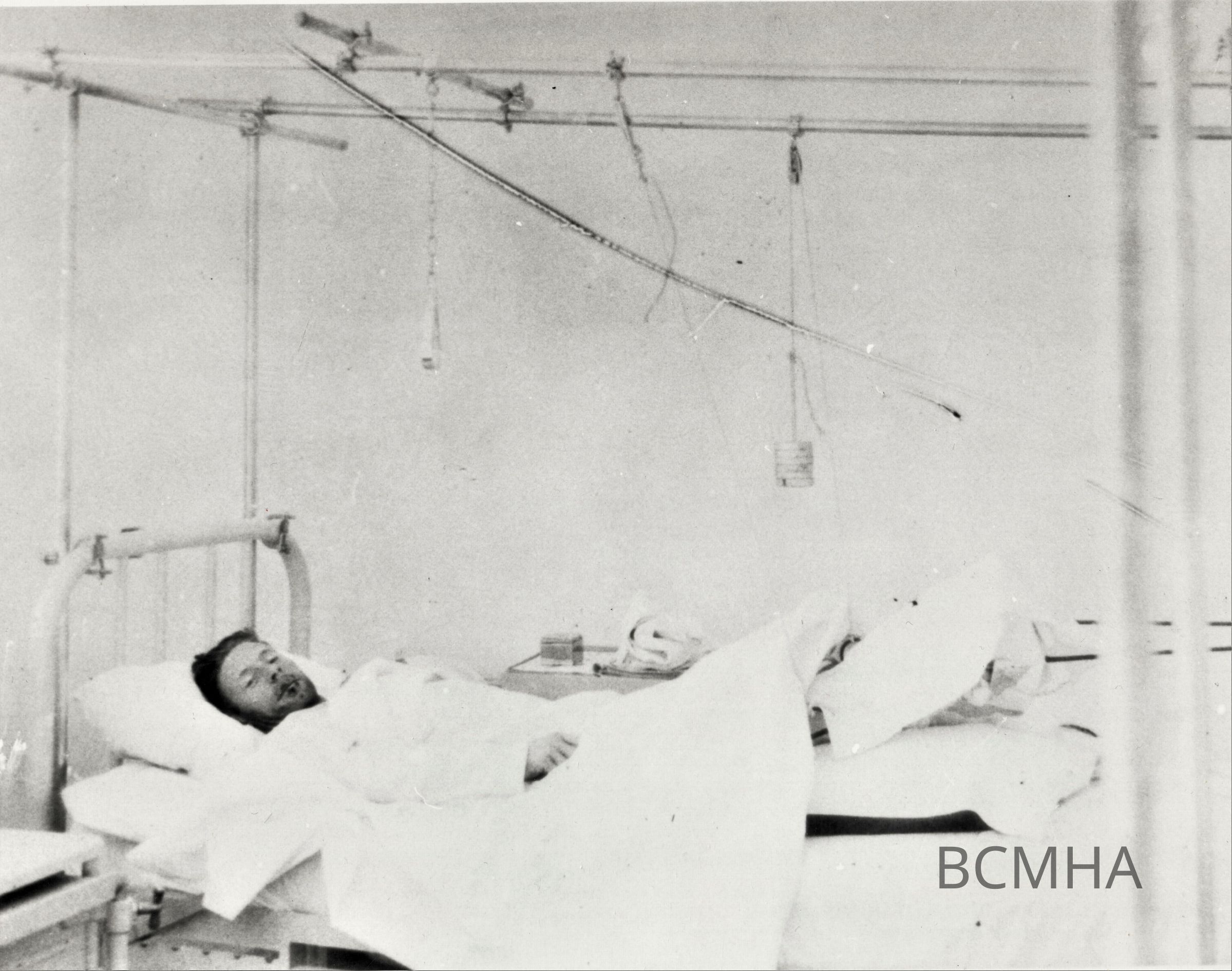 Boulder City hospital: Six Companies hospital patient, c. 1932-1933; Patient in orthopedic ward; USBR-Wash no. 952Location