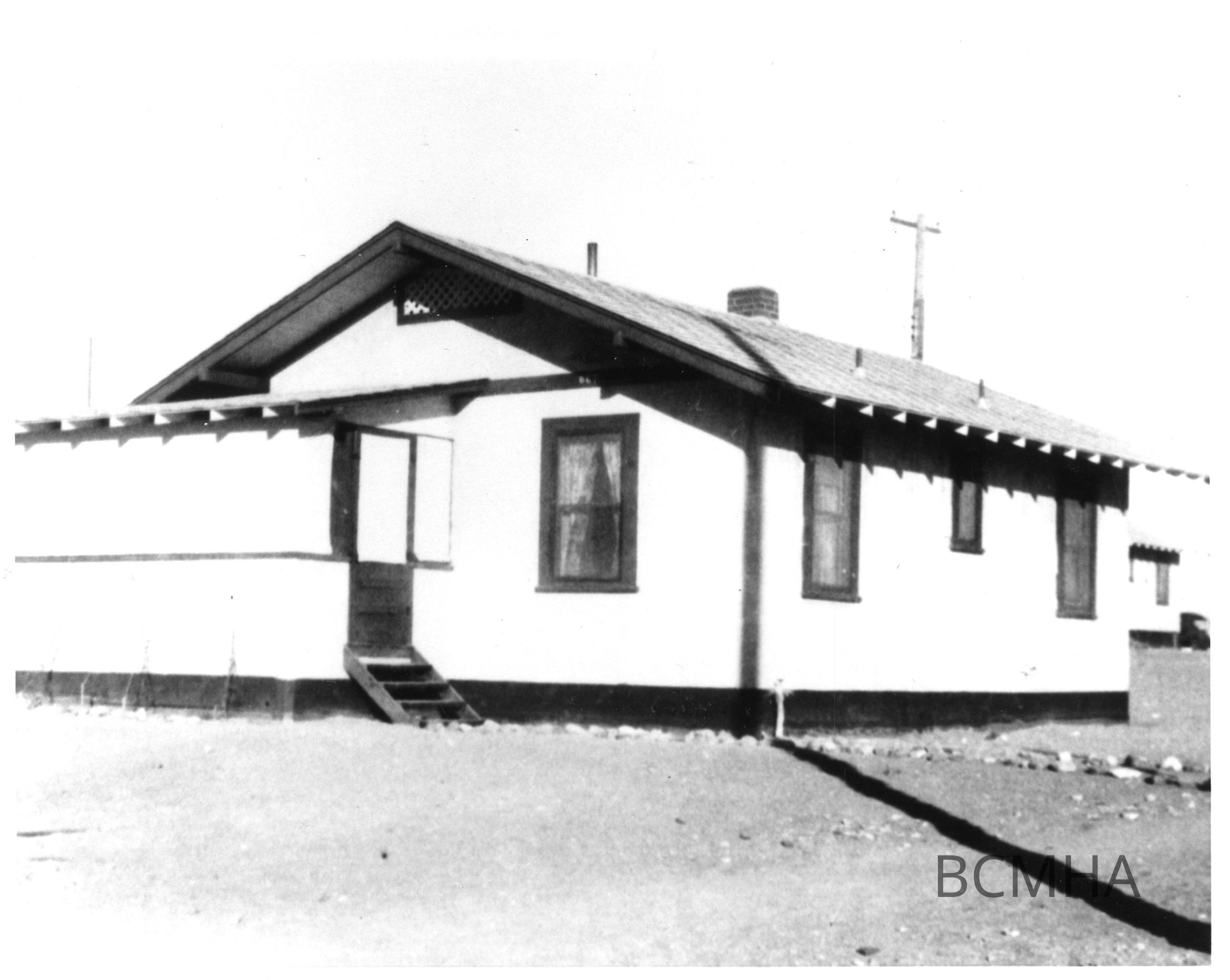 Notes: Title Overflow: Boulder City housing: Six Companies: Ave B, 1931032 "View of one of the 3 residences used as Boulder City's 1st school." Note: "This was a Six Companies house at the intersection of what was then Cherry St. now New Mexico St. This wasn’t the 1st school