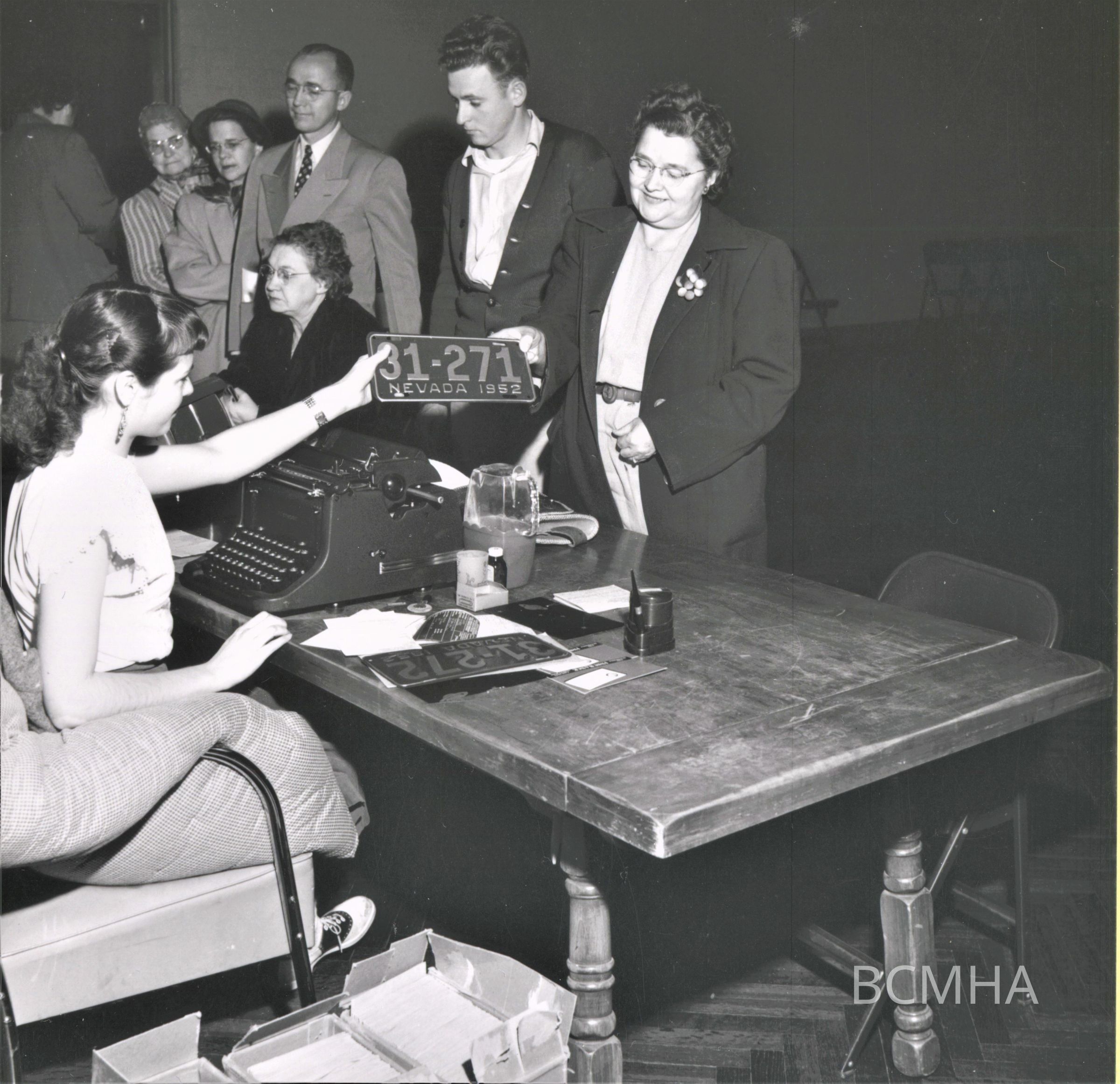 Boulder City incorporation: first license issued in Boulder City, January 15, 1952 ["Mrs. A.M. Harland (the former Donna Mae Burt) hands Mrs. Toni Baroch (549 Date Street) her automobile plate, which was the first one issued in Boulder City."] [see the Las Vegas Review Journal/Boulder City Journal, January 16, 1952, p.7]; NSMHS photo; Cliff Segerblom, photographerCollection