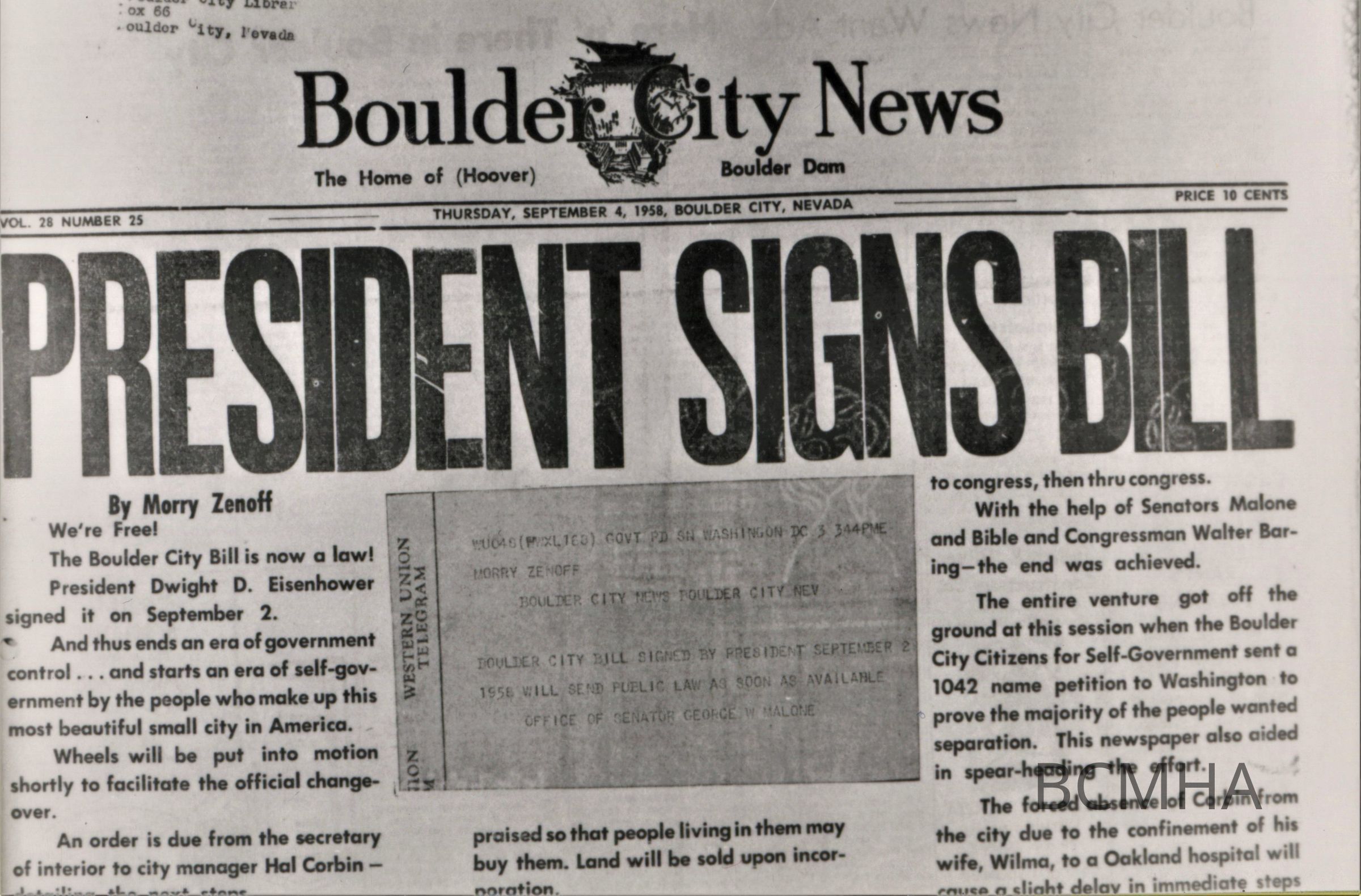 Boulder City-incorporation: headline, "President signs Bill"; Boulder City News, Th., September 4, 1958, p.1Collection