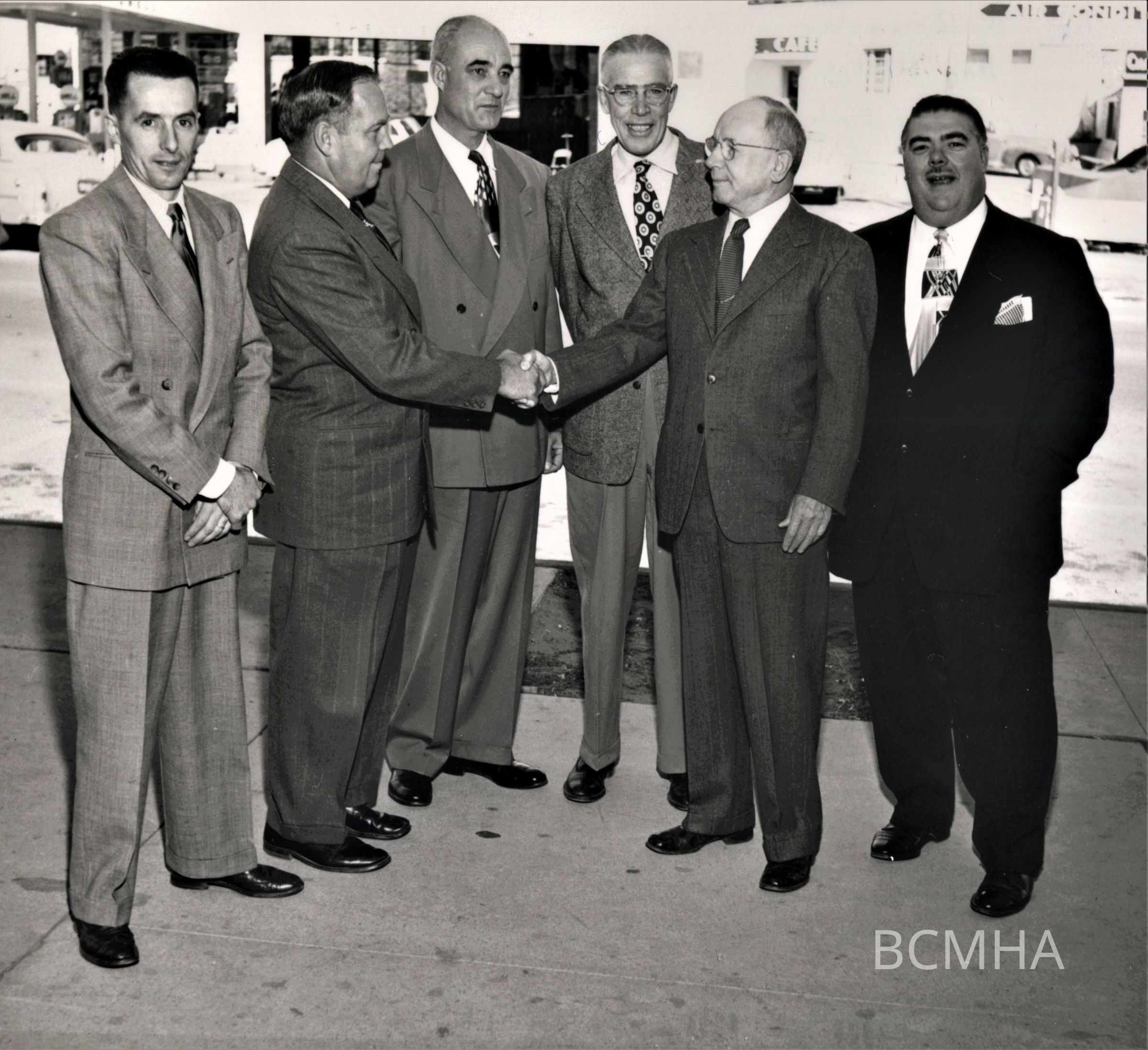 Boulder City incorporation: newly elected Advisory Council, November 4, 1951 [l-r: Al Roueche; Harold "Hop" Nellis; Bruce Eaton; Donal Jolley; Ernie Moritz, USBR Region 3 Director; W. Darlington Denit, USBR] [NSMHS photo; Cliff Segerblom, photographer]Collection
