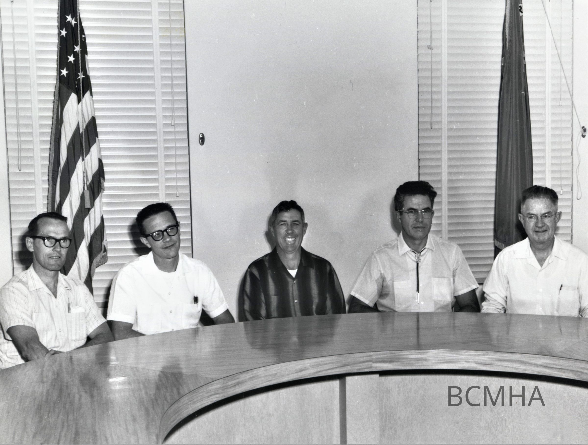 Boulder City- incorporation: newly elected Boulder City Council, October 1959 [l-r: Joe Manix; Robert Broadbent; Albert Franklin; Thomas White; Morgan Sweeney]; USBR photo no. P45-300-4087-2; R.C. Middleton, photographerCollection