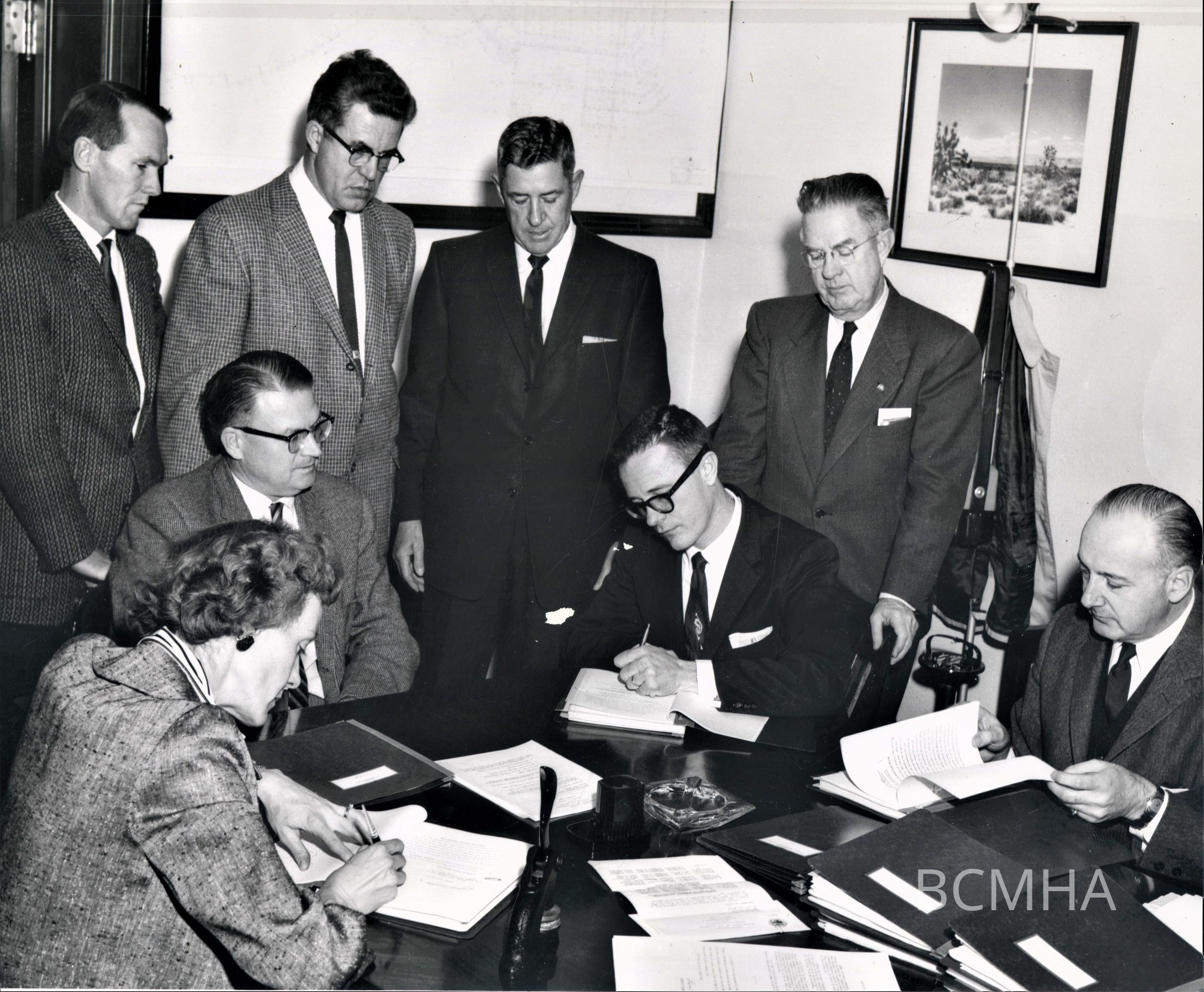 Boulder City incorporation: Official transfer of title to Boulder City from the Bureau of Reclamation: standing l-r: Joe Manix (BC councilman); Thomas White (BC councilman); Albert Franklin (BC councilman); Morgan Sweeney (BC councilman) seated l-r: Lorraine "Larry" Kautz (BC clerk); Arlewigh B. West (USBR regional director); Robert Broadbent (BC councilman/mayor); Milton W. Nathanson, January 4, 1960; USBR photo no P45-300-3876 A; R.C. Middleton, photographerCollection