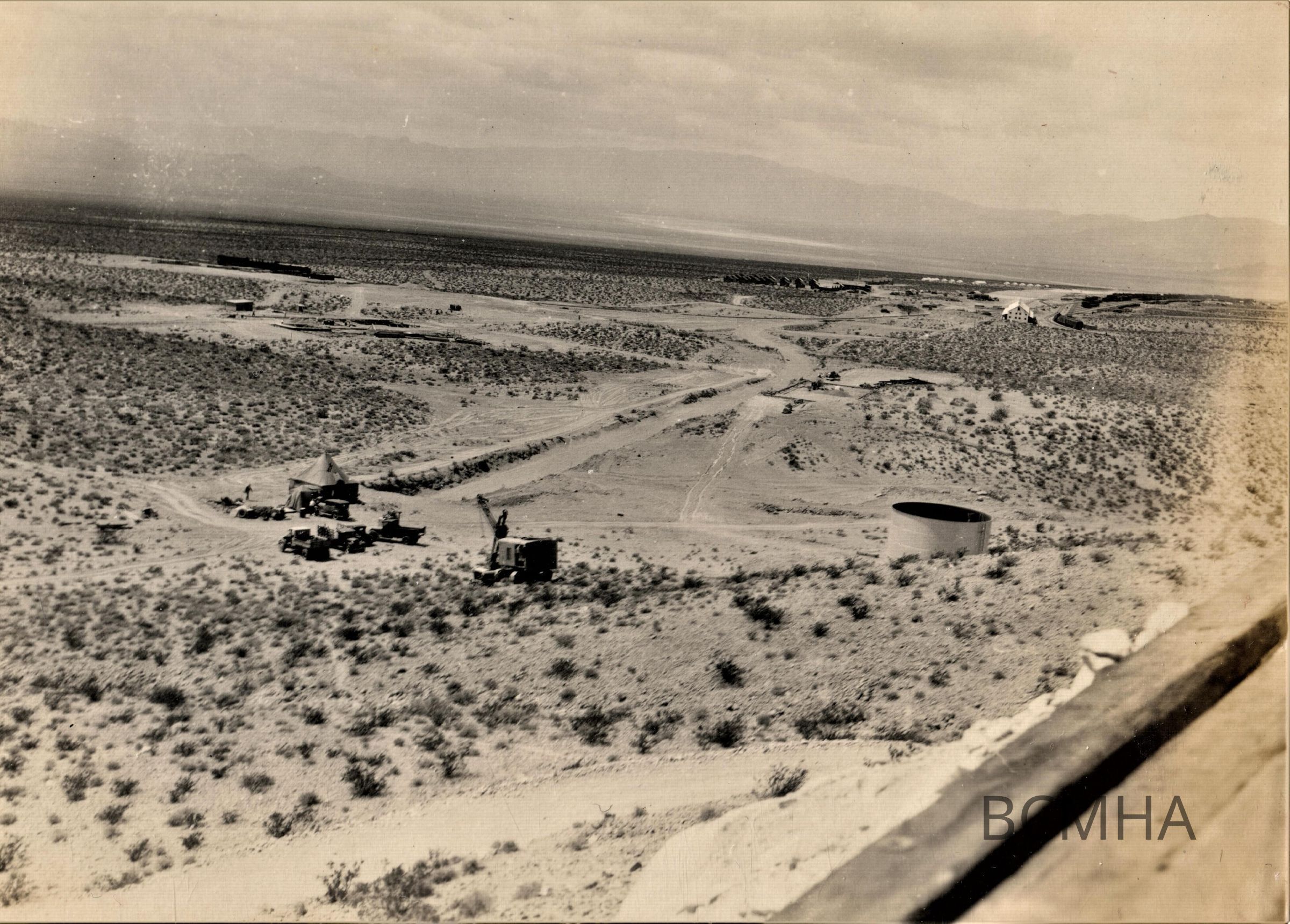 Notes: Description continued: Colorado St.; the white building in the right distance is the Six Companies warehouse; to the upper left of the regulating tank is foundation for the U.S. Bureau of Reclamation warehouse)