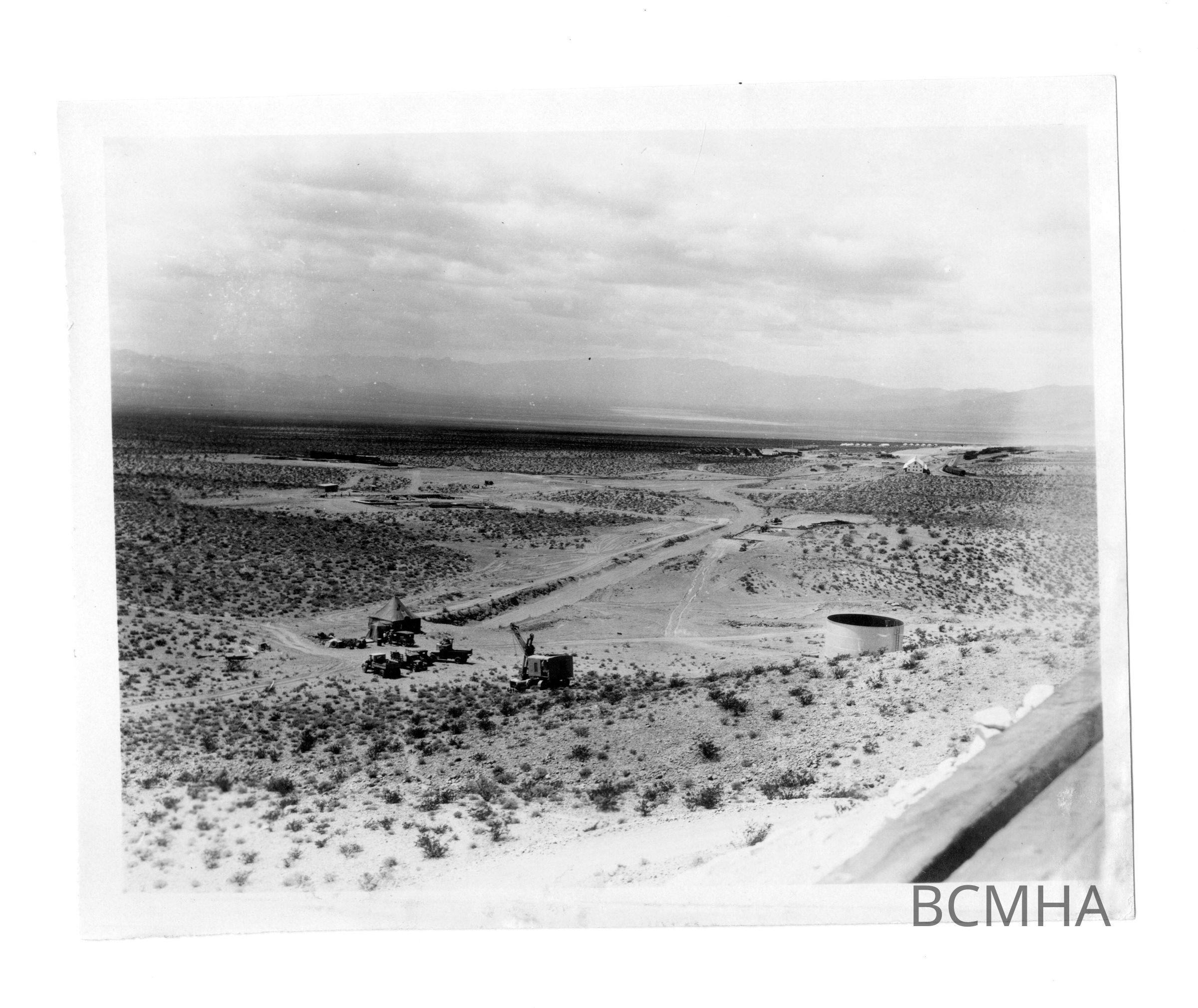 Notes: Description continued: Colorado St.; the white building in the right distance is the Six Companies warehouse; to the upper left of the regulating tank is foundation for the U.S. Bureau of Reclamation warehouse)