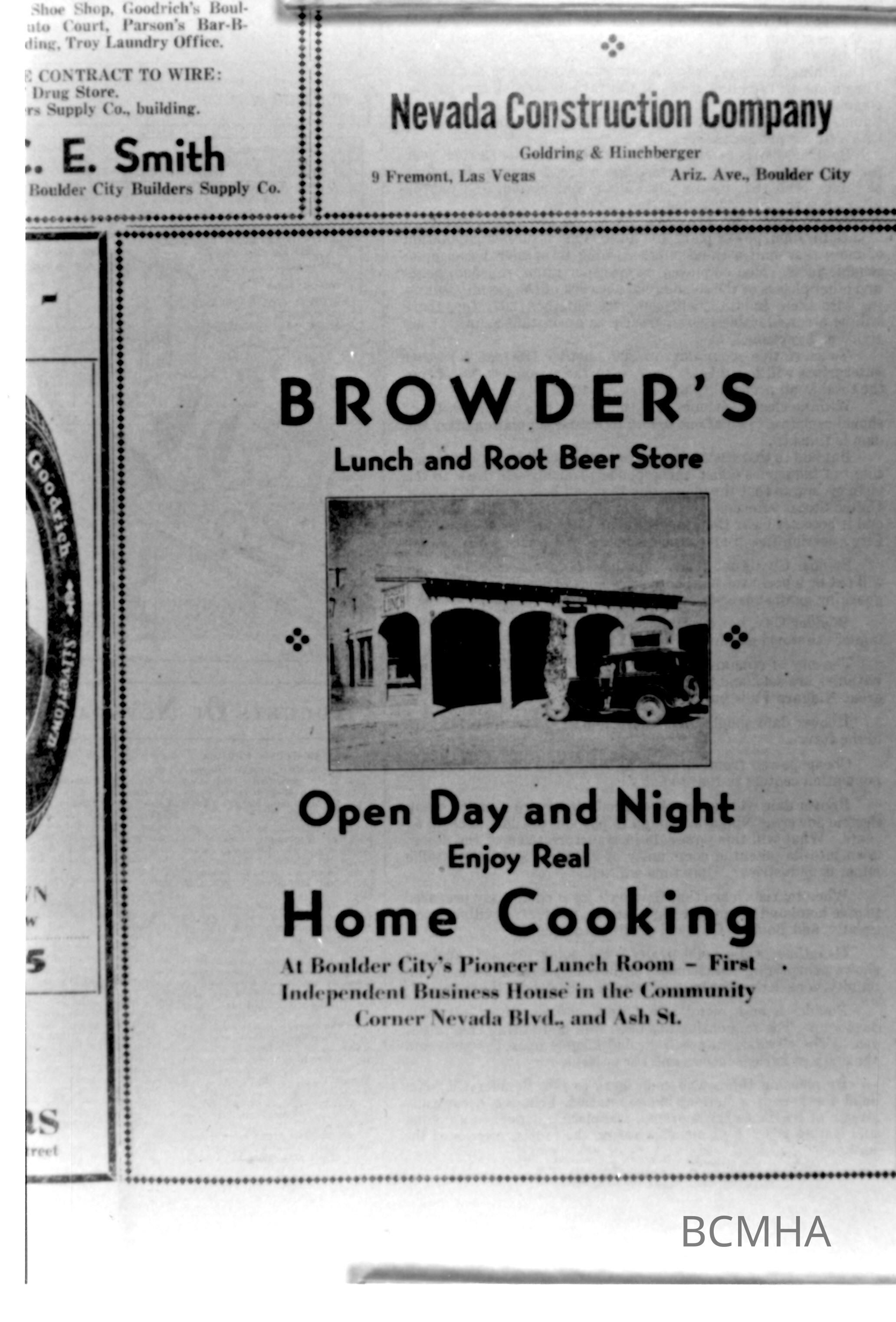 Boulder City restaurants: Browder's Lunch 1932: AdvertisementEntry/Object ID