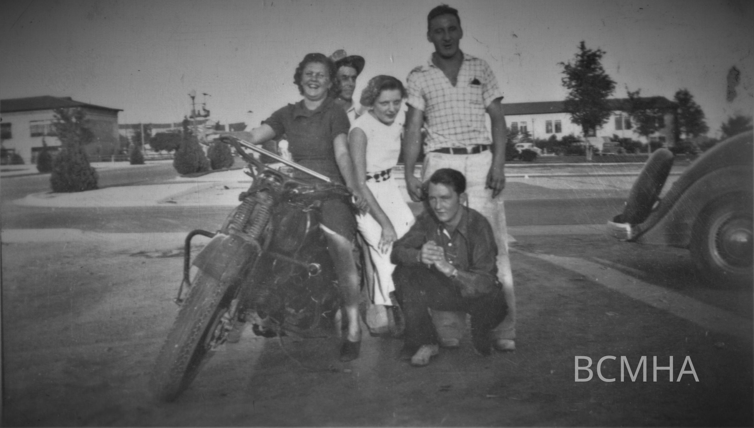 Boulder City restaurants, cafes, coffeehouses: Smith's Root Beer, c. 1936, l-r: Dorothy Bodkin on motorcycle; all others are unidentifiedCollection