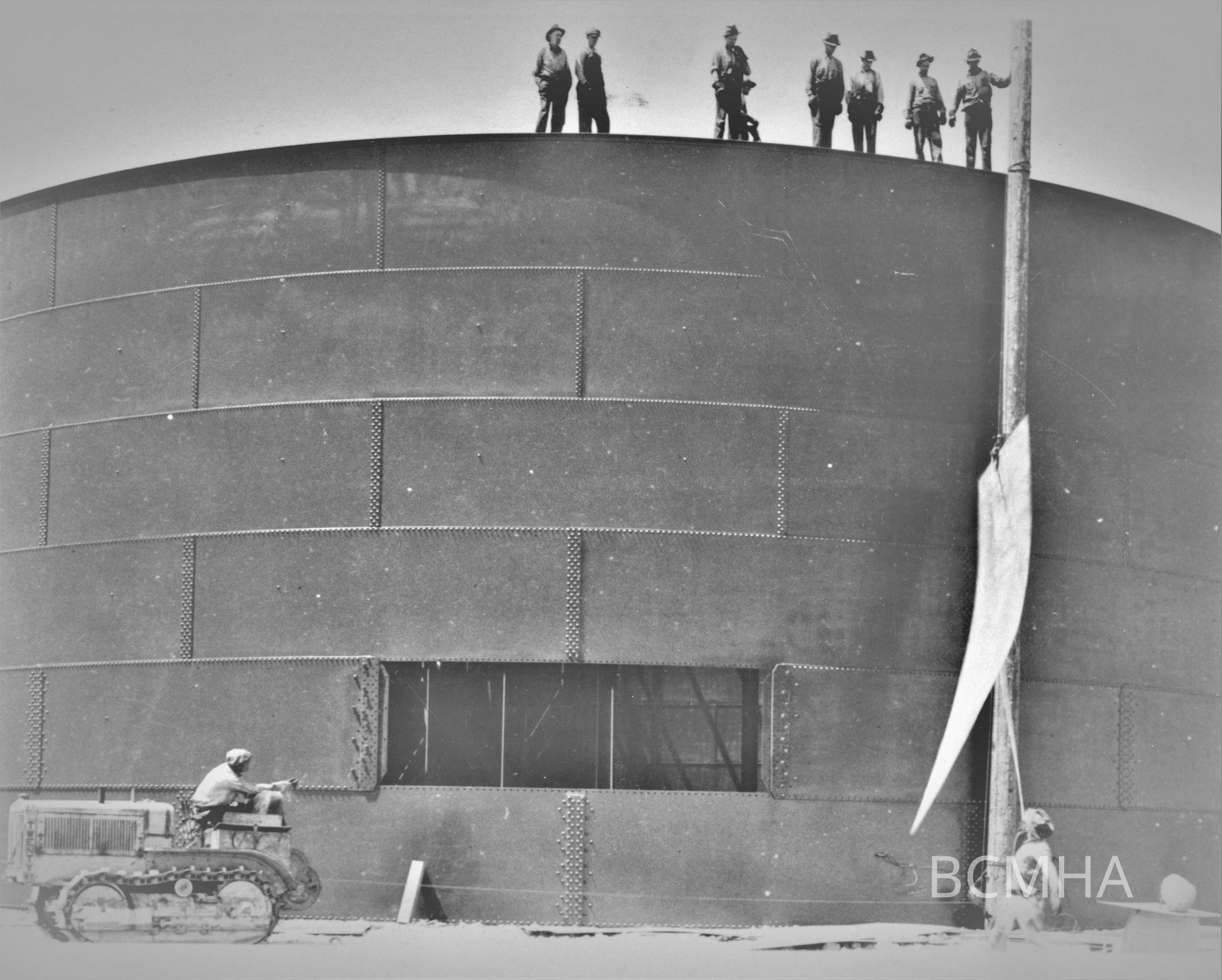 Boulder City; water system; The last sheet of iron being hoisted into place; on Boulder City’s water storage tank; Mid - 1931; Boulder City Library; Graphic Views of Hoover Dam; photo no. 97; Winthrop A. Davis, photographer; Roll 12 - Photo. No. 5; Copy Negative; Bureau of ReclamationCollection