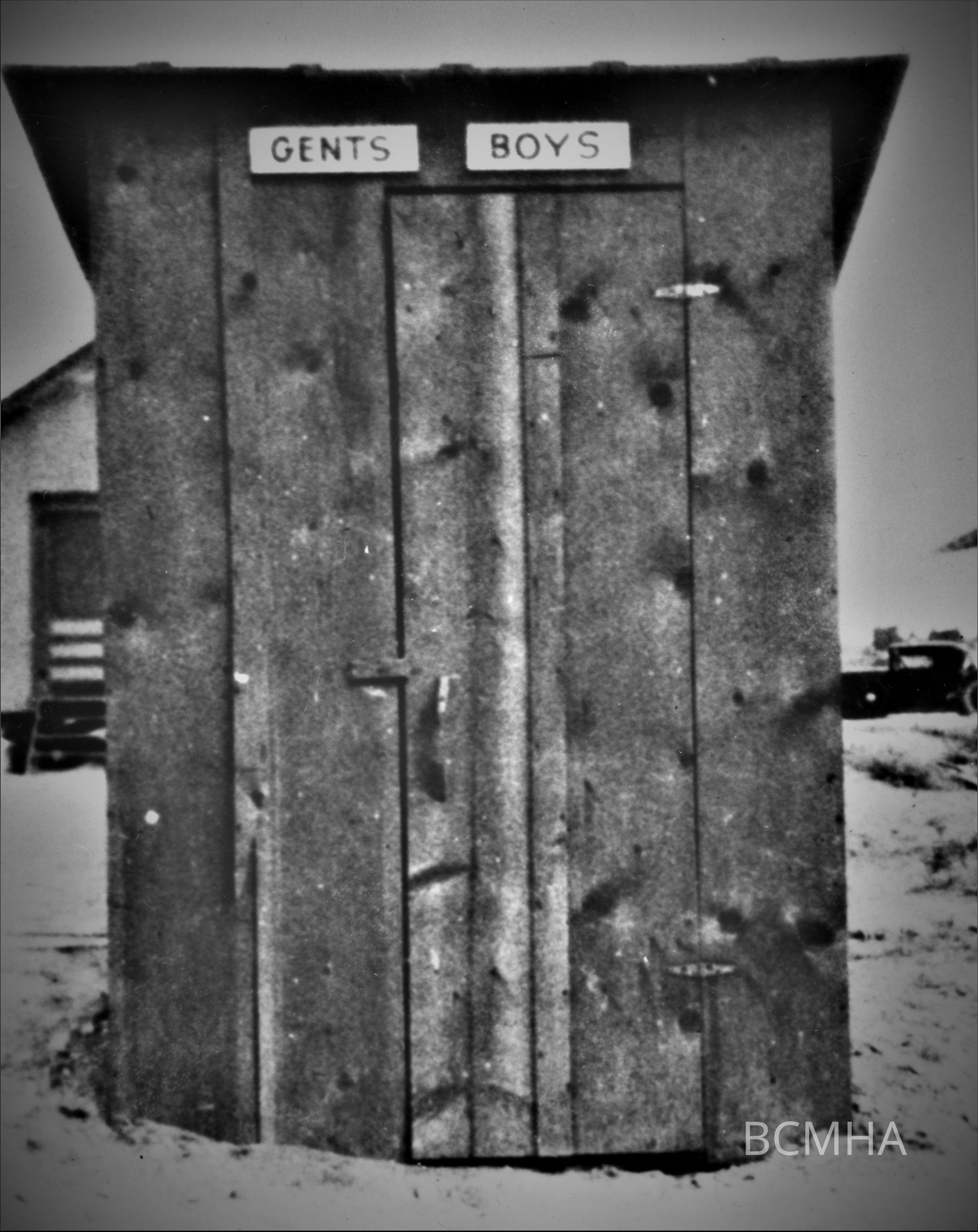 Boulder City schools: Boulder City School, c. 1931; "A typical privy used by the school children of Boulder City in their first residential schools, later replaced by a federal sewage disposal system."