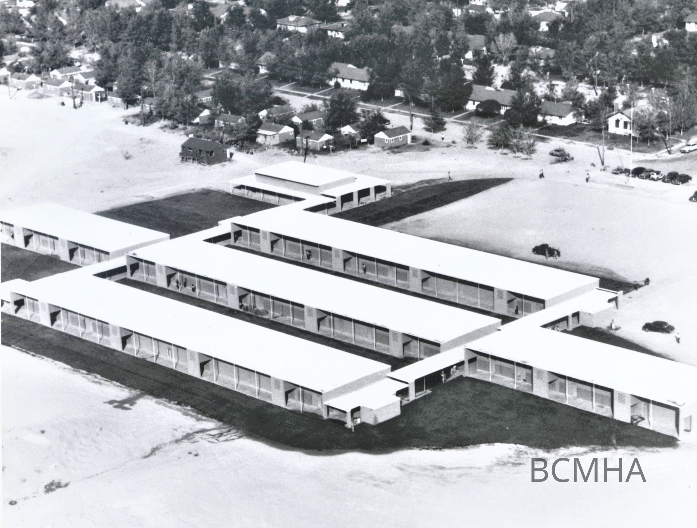 Boulder City schools: Boulder City Junior-Senior High School under construction, 1949; The houses along Fifth Street in the left center of the photograph are the demountable houses brought in by the government in 1942 to ease the wartime housing shortage in Boulder CityCollection