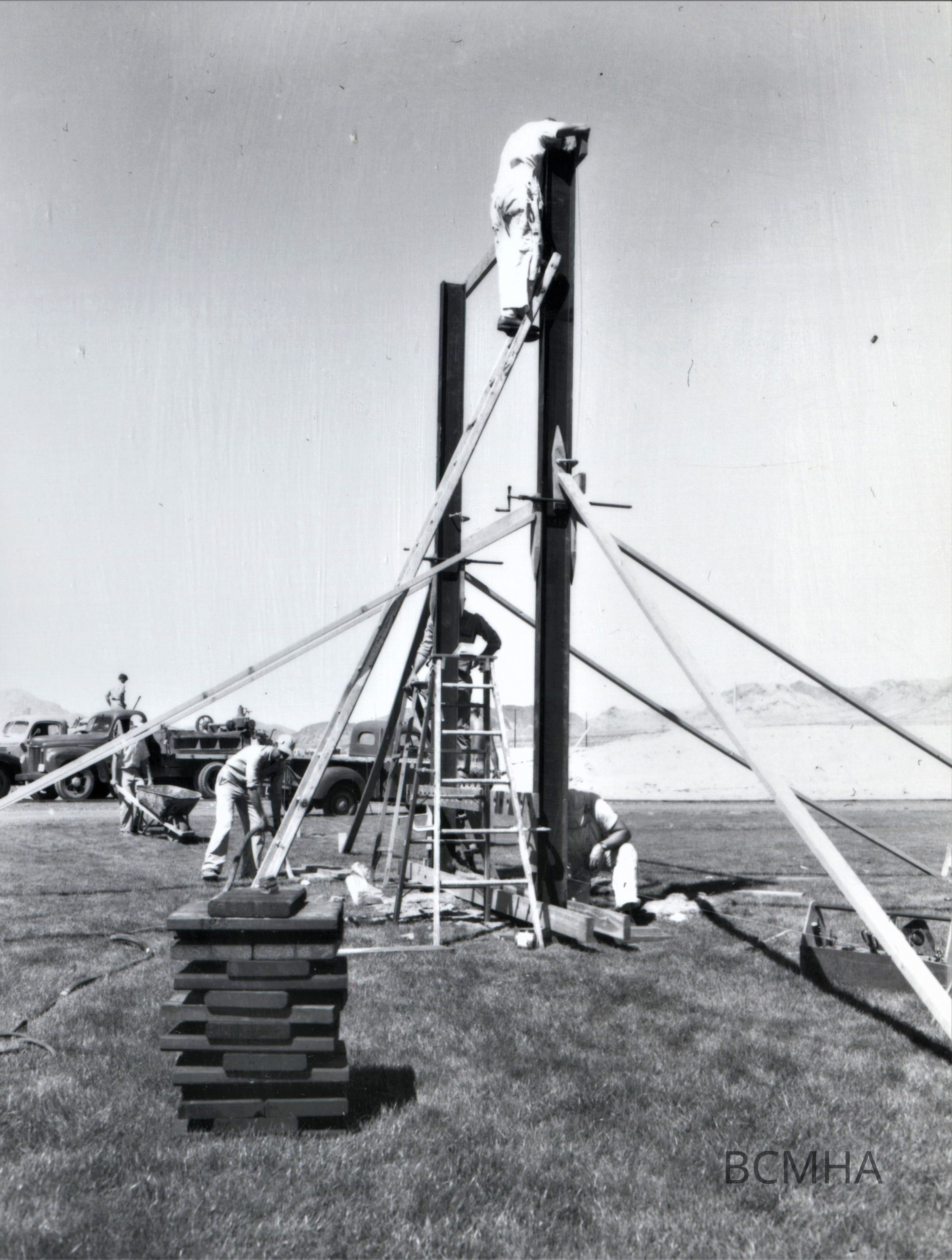 Boulder City schools: Boulder City Junior-Senior High School erecting the goal posts on the new athletic field, c. 1951Collection