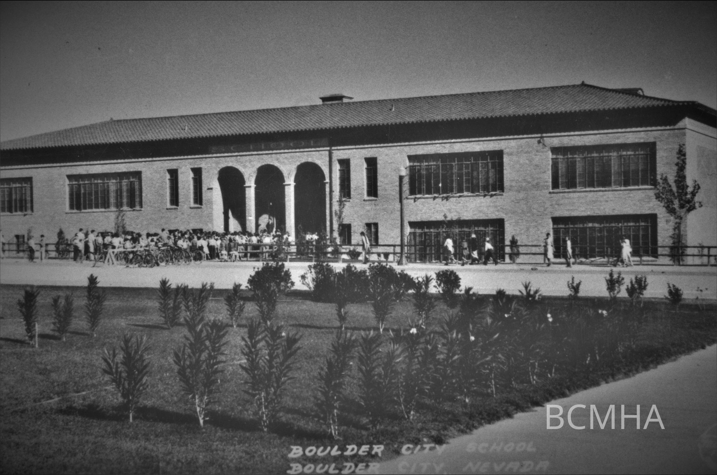 Boulder City schools: Boulder City School, 1933: view from North Escalante Plaza; note new landscaping; Frasher's b&w real - photo postcardCollection
