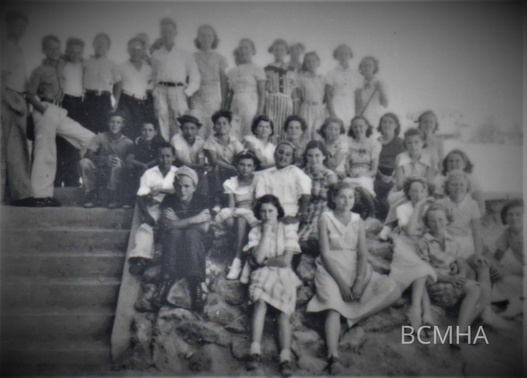 Boulder City schools: classes, c. 1932-34: 7th grade 1932: back row, l-r: second from left Mervyn Brannan; Buck Gallagher; Ed Blair wearing glasses; third from right, in second row, from top, Helen French [father owned the Hardware store]; front row sitting middle, wide legged, Iris Montague; to her left in pleaded skirt Gerry Sleipner; Hobert Blair photoCollection