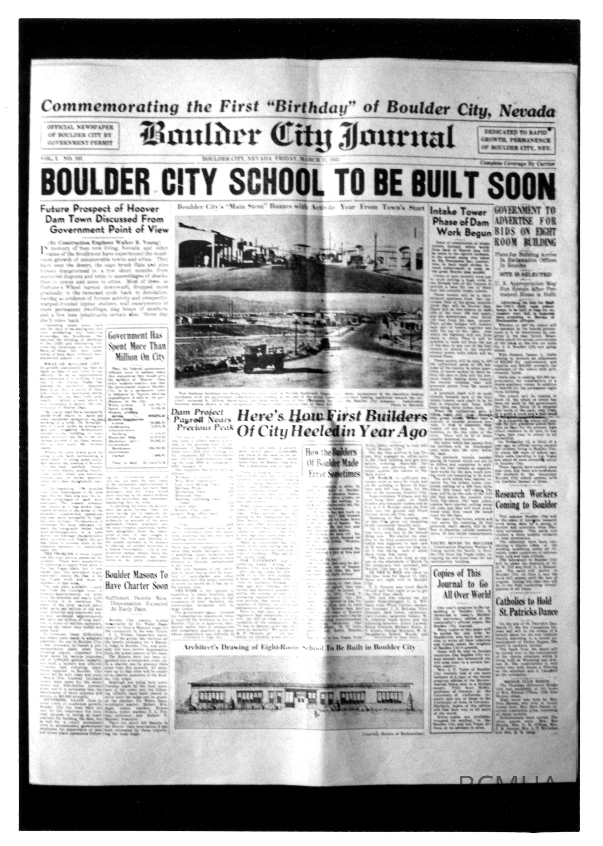 Boulder City Schools: headline announcing construction of the Boulder City School ;Boulder City Journal, Mar. 11, 1932Made/Created