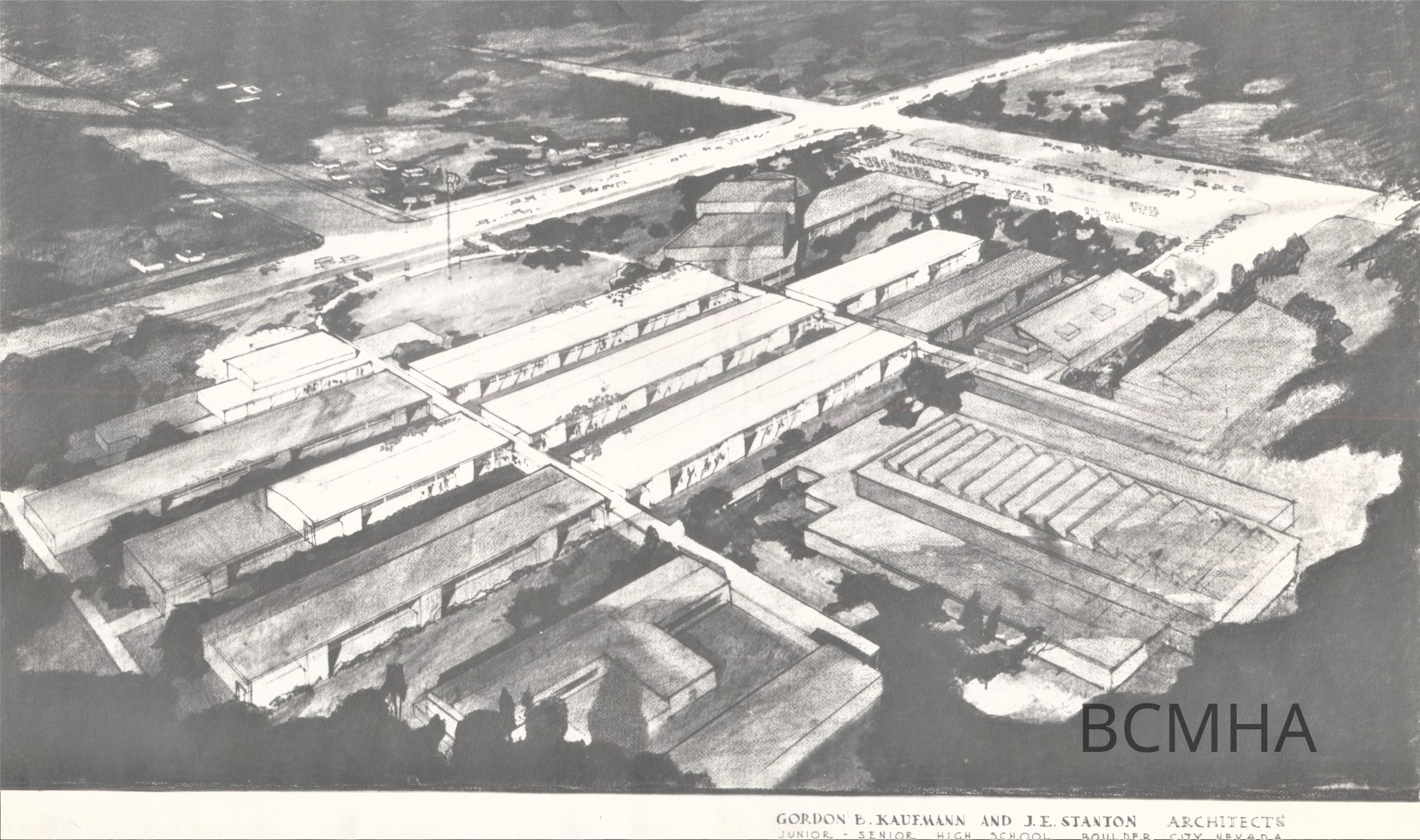Boulder City schools: high school: artist's conception for a new junior-senior high school, c. 1948; designed by Gordon B. Kaufmann and J.E. Stanton; see Boulder City News, Th., September 8, 1948, p.3Collection
