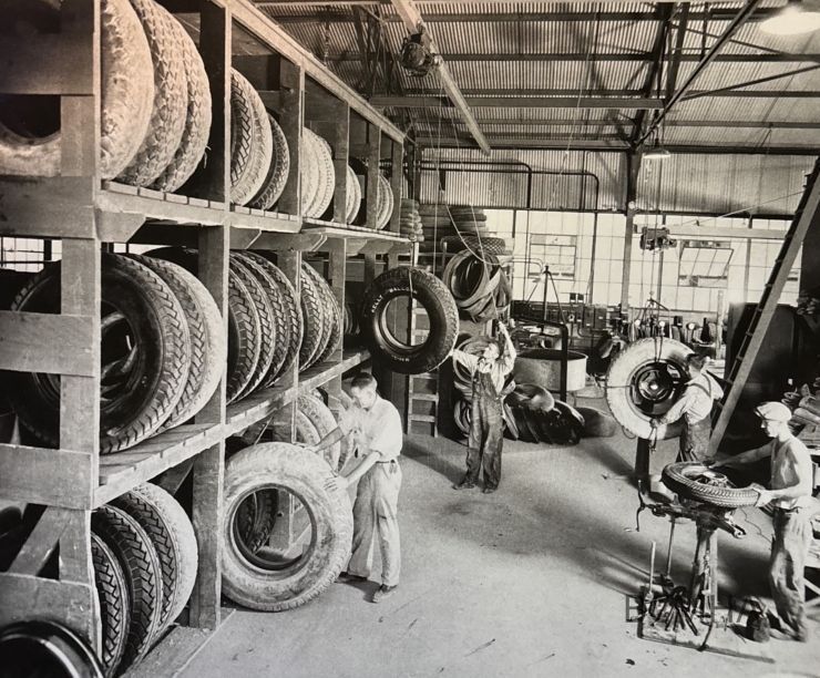 Boulder City; Six Co.'s. garage; August 19, 1932; Interior of the tire shop of Six Companies, Inc. garage; Complete equipment is installed for the rehabilitation and repair of all classes of tires used.; in 1936, this became the U. S. Bureau of Mines electrometallurgical pilot plant; Boulder City Library; Bachtel album no. 2, photo no. 1474Lexicon