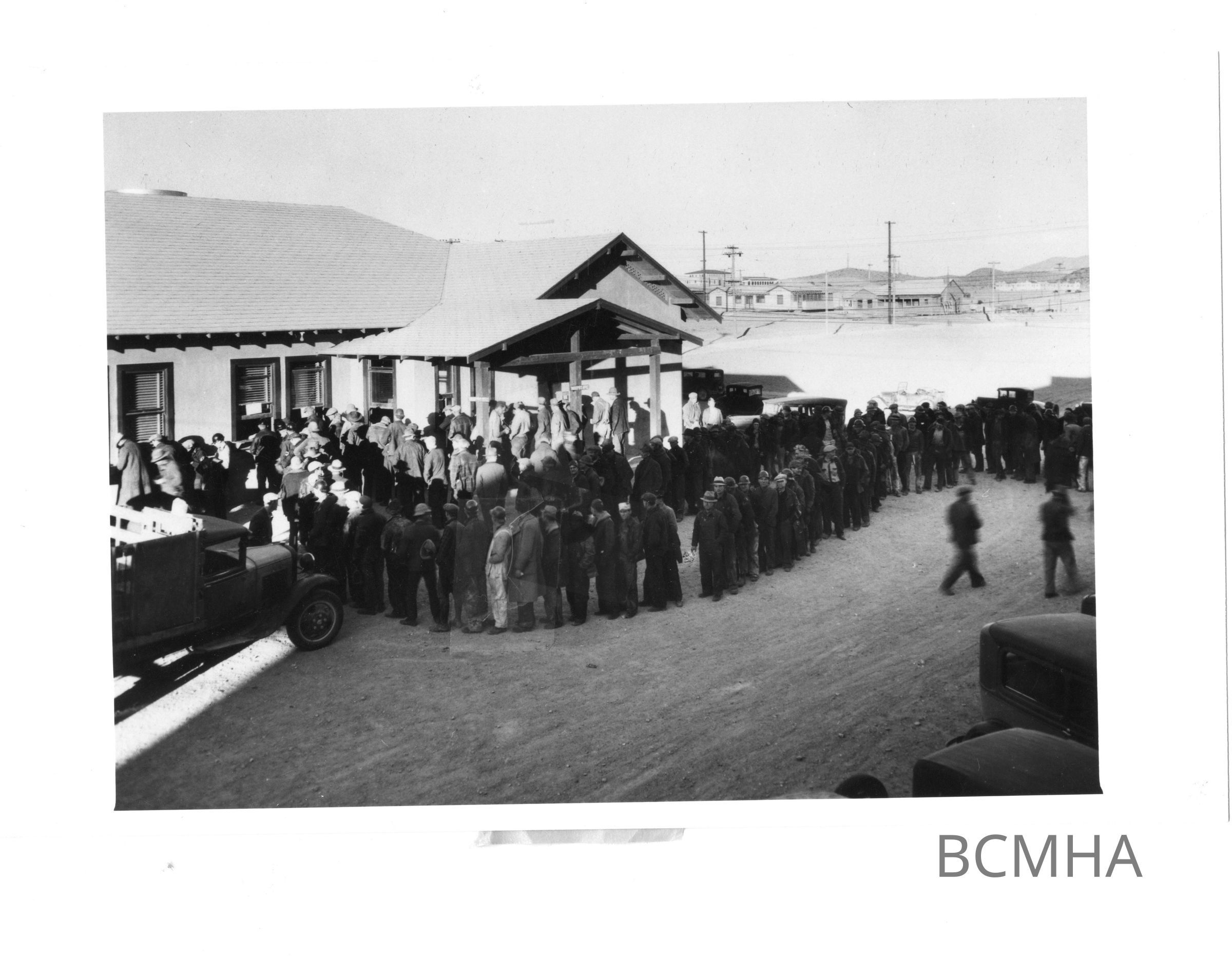 Boulder City Six Co.'s: payday; collected at the paymaster's window behind the Six Cos. office building; the men are paid on the 10th & 25th of each month; This view shows the swing shift lined up at the paymaster's window on Jan. 25, 1932; Boulder City Library; Bechtel album; photo no. 822Made/Created