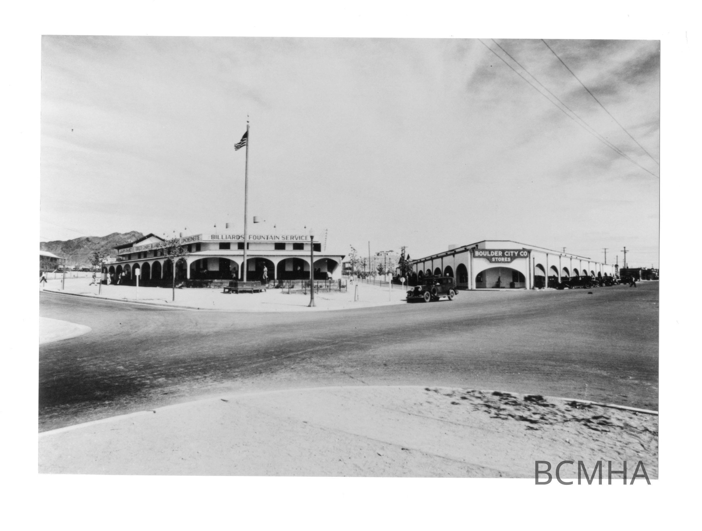 Boulder City; Six Co.'s.recreation hall; Foreground: Intersection of Nevada Way; Birch Street; Cherry Street; and New Mexico; USBR; Wash. no. 2093/ temp no. 1609; Ben Glaha, photographerMade/Created