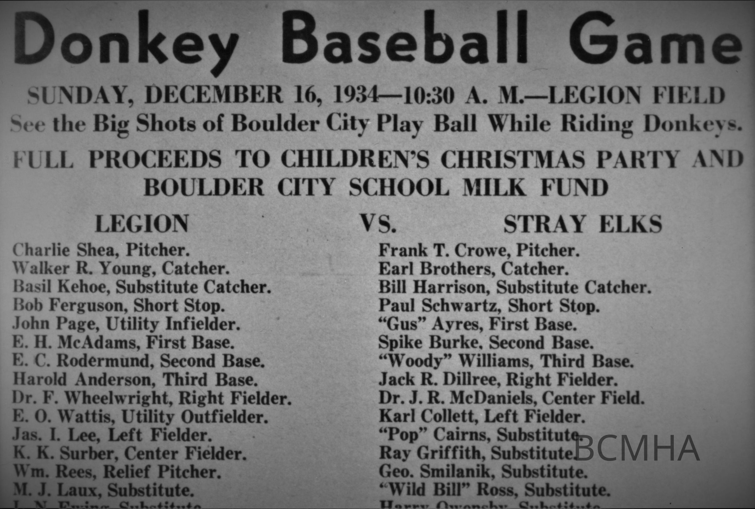 Boulder City sports and recreation: Donkey Baseball game program, December 16, 1934; this program is stored in posters & broadsides- box 1Collection