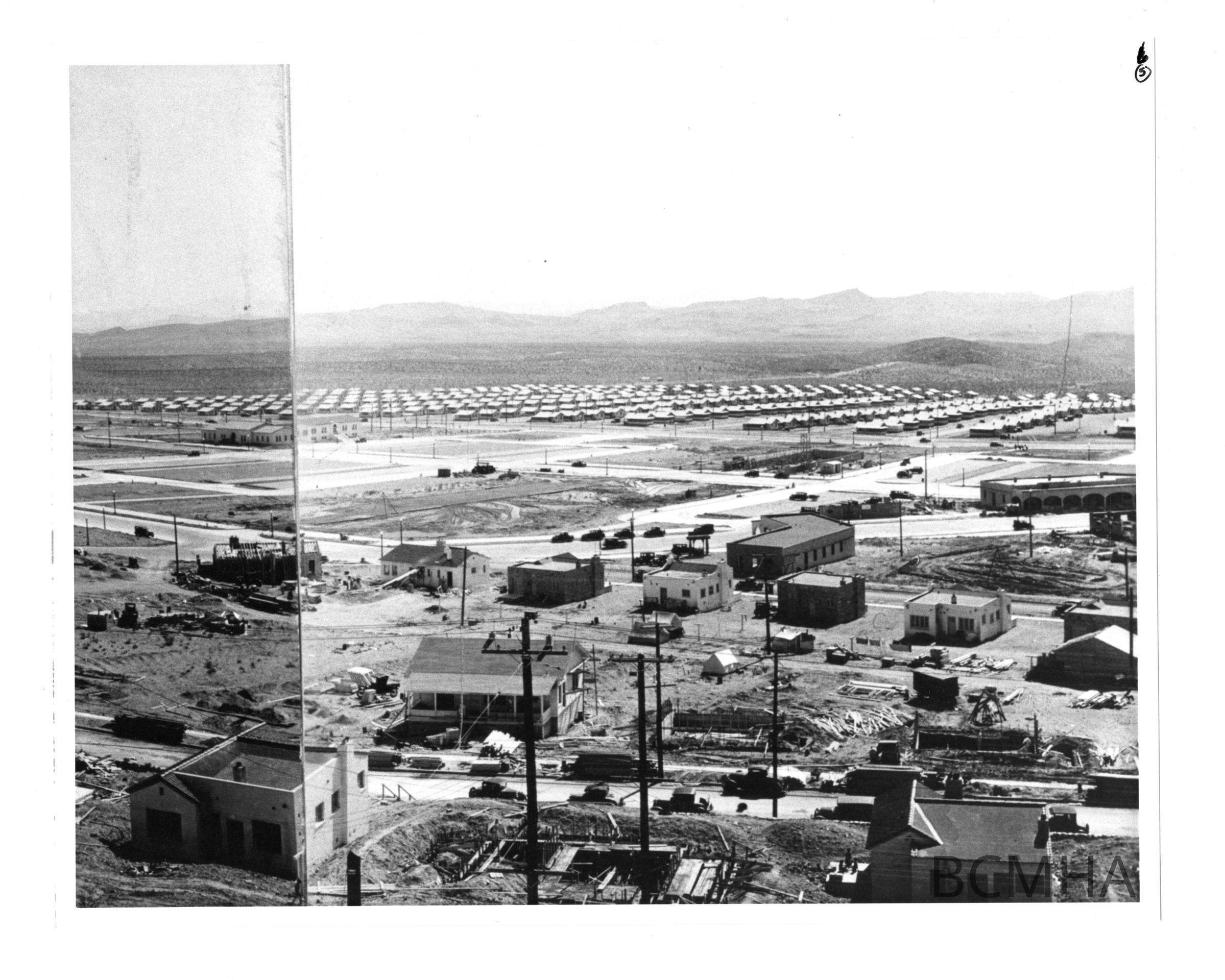 Boulder City panorama; early 1932; panel 5 of 6; center right: Boulder Theater under constructionMade/Created