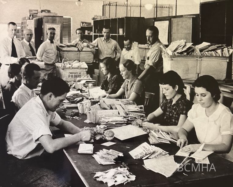 Boulder City; U.S. Bureau of Reclamation; Municipal Building; Special force of clerks; handling initial mailing of Boulder Dam stamps through Boulder City Post Office; More than 200,000 stamps were mailed out under the first date of issue; Every country on the globe was represented in the mailing with envelopes addressed to hundreds of notables; King George; King Fuad; and others; September 30, 1935; USBR- Wash. no, 3282; Ben Glaha, photographerMade/Created