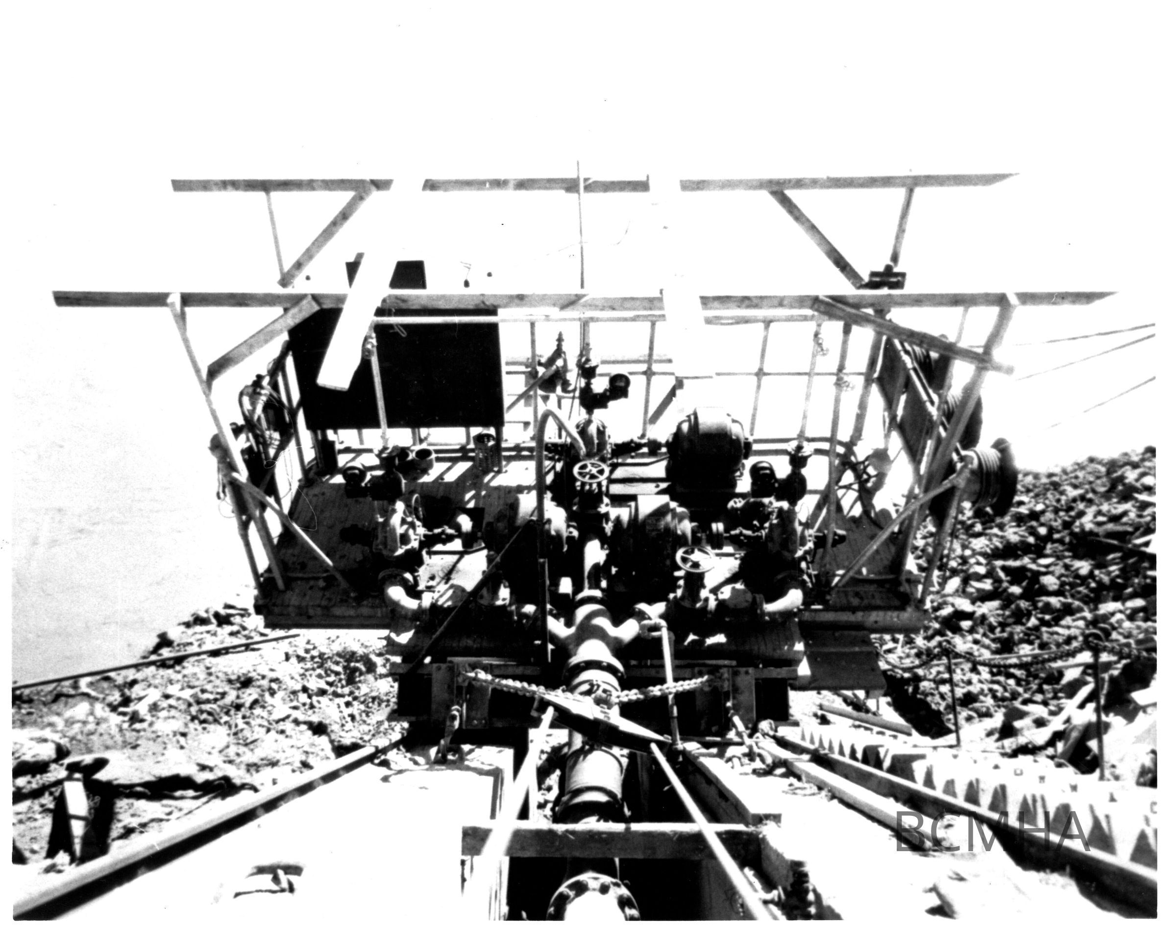 Boulder City water system: Extension of water pipe to upper batch plant. BC water supply. movable pump on the shore of the Colorado River in Black Canyon, c. 1932-35; UNLV Library - Special Collections Copy Negative; UNLS - Cutright Collection; 0123:0071Collection