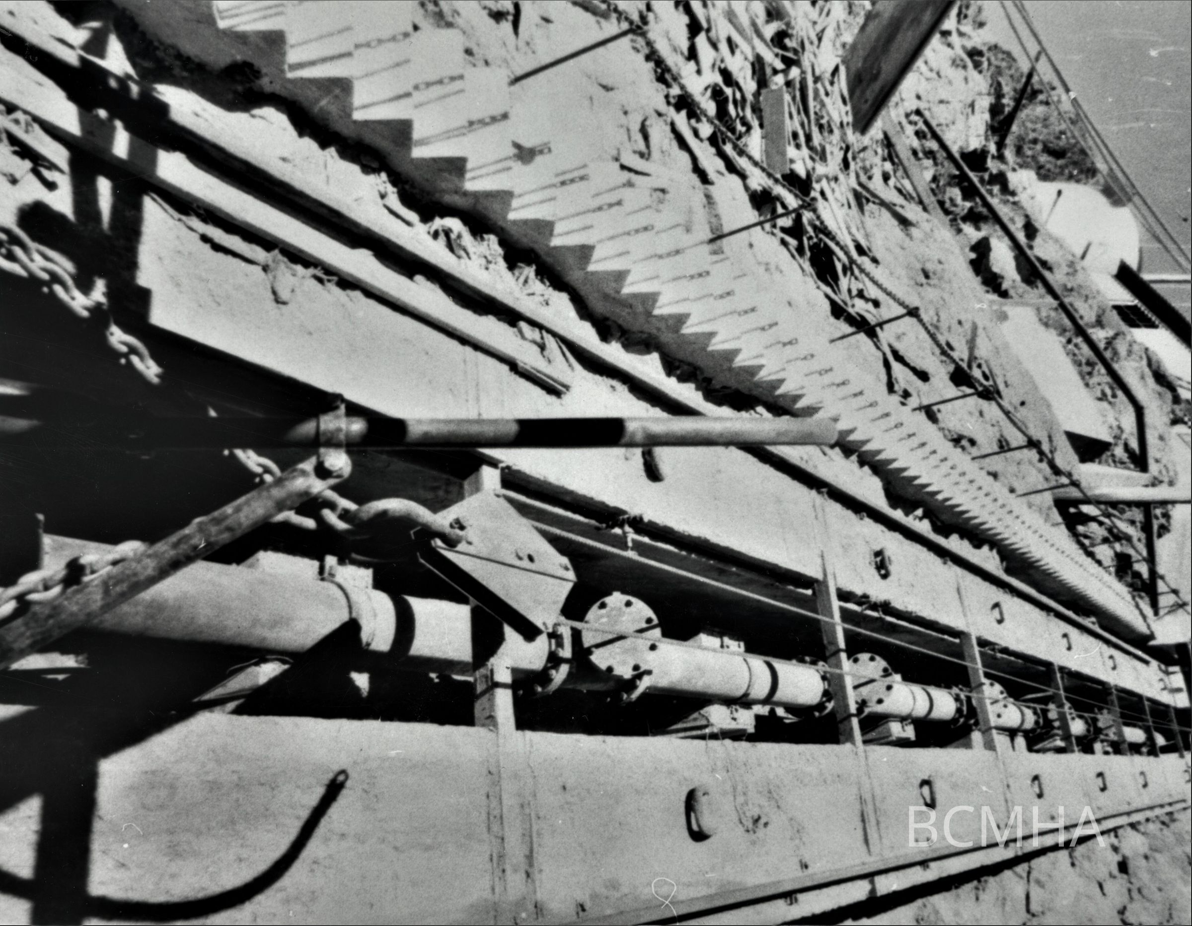Boulder City water system: Extension of water pipe to upper batch plant. BC water supply. Movable pump on the shore of the Colorado River in Black Canyon, c. 1932-1935; UNLV Library - Special Collections Copy Negative; UNLS - Cutright Collection; 0123:0072Collection